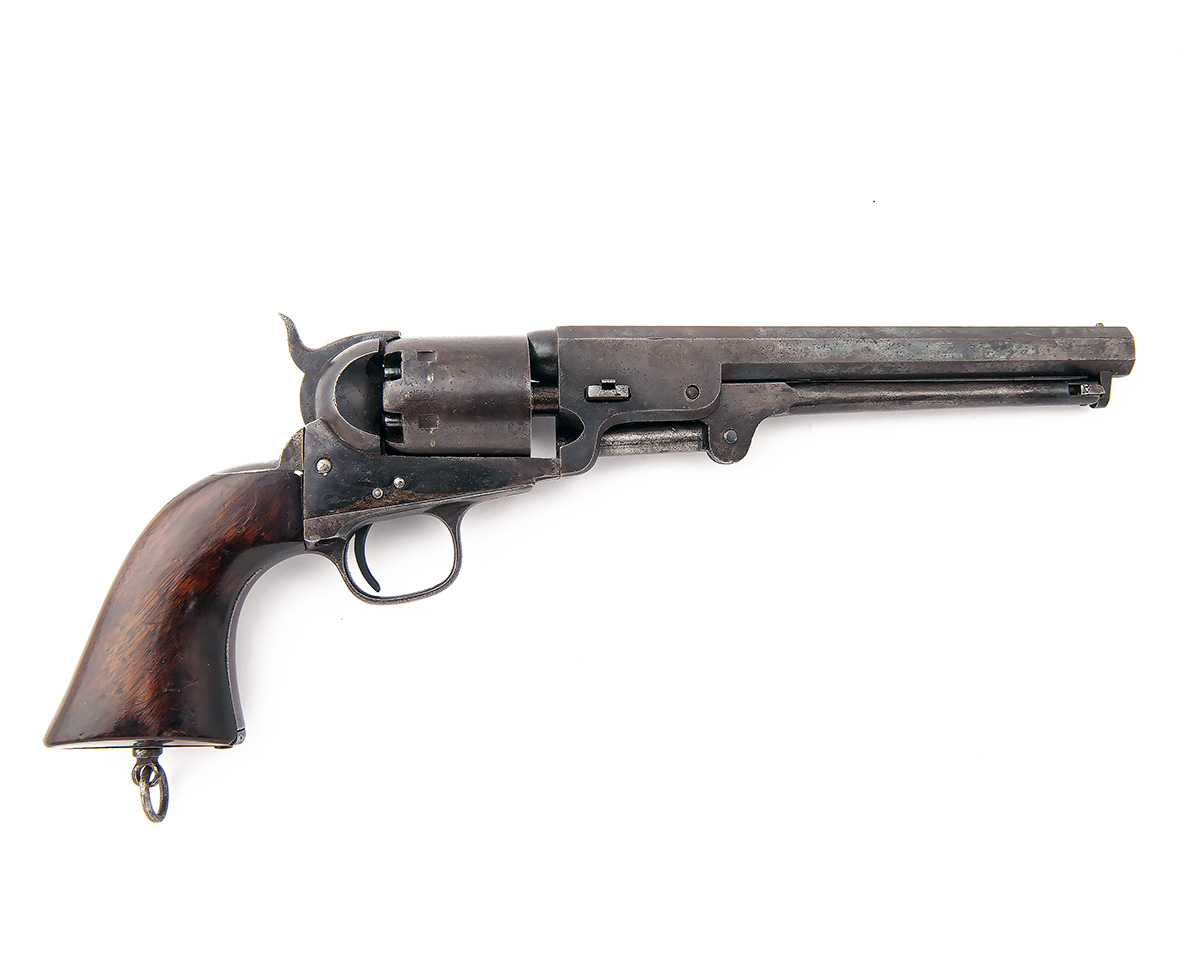 for 1855, with 7 1/2in. octagonal barrel signed on the top 'ADDRESS COL. COLT LONDON', the left hand side of barrel-mount with London proofs (rubbed) and a 'W.D' broad arrow device (possibly added later), six-shot cylinder scrubbed of scene, open iron frame marked 'COLTS PATENT', iron grip-straps, smooth walnut grip, lanyard ring at heel, all matching numbers including wedge, re-finished in antiquity