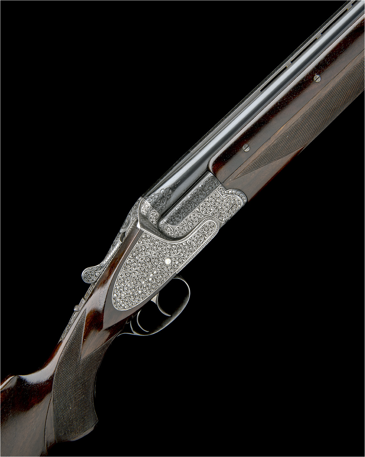 28in. nitro barrels with 8mm ventilated matt top-rib, the breech end carved with bold Germanic scroll detailing, 2 3/4in. chambers, bored approx. 1/2 and full choke, three-piece fore-end, automatic safety, hand-detachable lockplates with concealed flush release lever and gold-inlaid cocking-indicators, articulated front trigger, rolled-edge triggerguard, the action, lockplates and furniture profusely relief engraved with best bold Germanic scrollwork on a matt background, surrounded by floral and crosshatch borders, bright finish overall, gold-washed internal lockwork, 14 5/8in. well-figured pistolgrip stock, weight 7lb. 10oz.