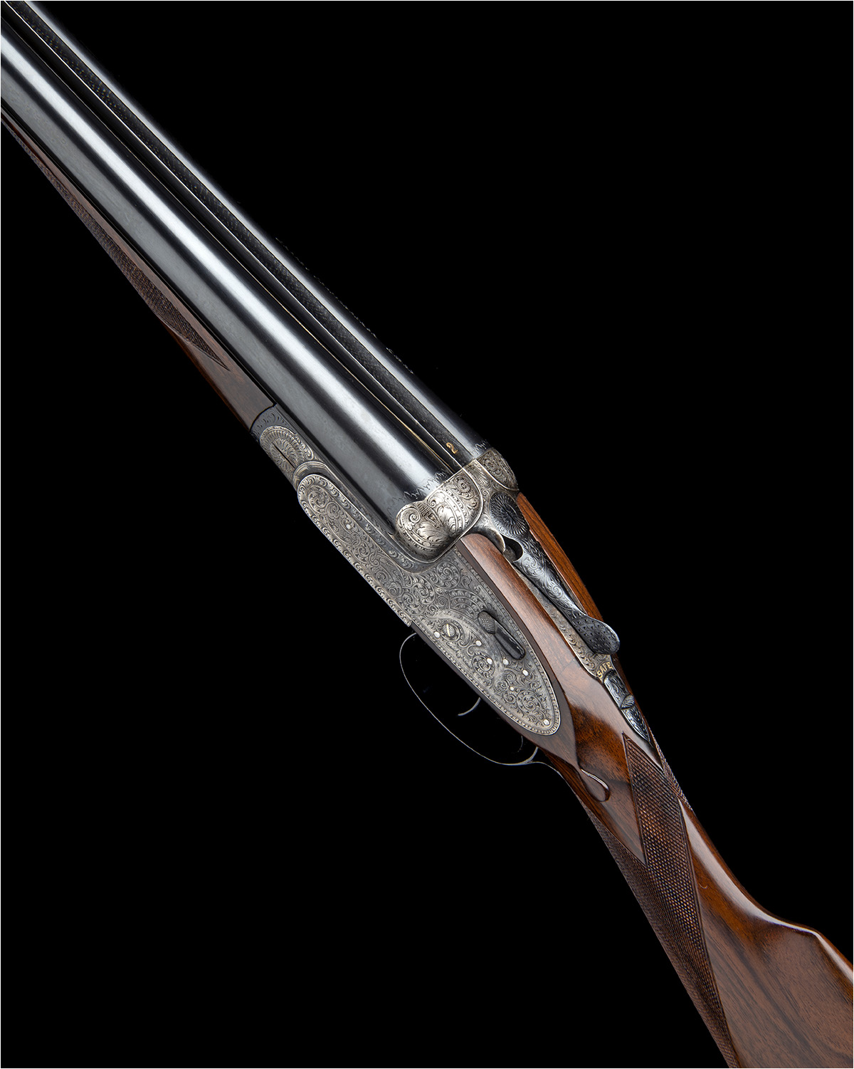 30in. nitro chopperlump barrels (proof dated for 1948) with raised matt rib gold-inlaid '2' at the breech end, the right tube engraved 'LAZARO ARRIZABALAGA. EIBAR', 2 3/4in. choke, bored approx. full choke in both, treble-grip action with hidden third bite and side-clips, removable striker discs, automatic safety with gold-inlaid 'SAFE' detail, hand-detachable lockplates, gold-inlaid cocking-indicators, Holland & Holland style self opening system, articulated front trigger, rolled-edge triggerguard, action and barrel flats marked 'FCE DE J. ARRIZABALAGA EIBAR', bold acanthus scroll engraving on a matted background, the lockplates with scrolling banners engraved 'L. ARRIZABALAGA', the underside with an elaborate cartouche engraved 'LAZARO ARRIZABALAGA PATENTE 150989', retaining traces of colour-hardening and renewed finish, 13 5/8in. well-figured replacement stock (inserts at overhorns), matching replacement fore-end wood, weight 7lb. 1oz., in a leather motor case with provision for both sets of barrels