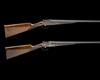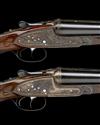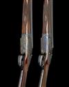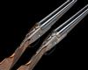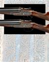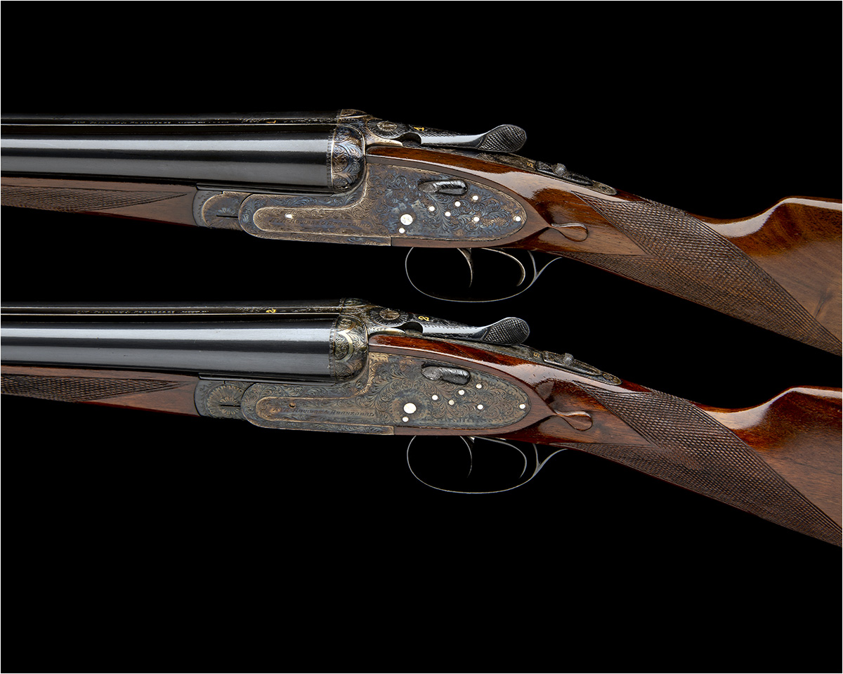 26in. nitro chopperlump barrels, ribs gold-inlaid '1' and '2' at the breech ends, 2 3/4in. chambers, bored approx. imp. cyl. and 1/4 choke, engraved arcaded fences, removable striker discs, toplevers gold-inlaid '1' and '2', automatic safeties with gold-inlaid 'S' details, hand-detachable lockplates, gold-inlaid cocking-indicators, articulated front triggers, rolled-edge triggerguards, acanthus scroll engraving, retaining virtually full original colour-hardening and finish, 14 5/8in. stocks, weight 6lb.