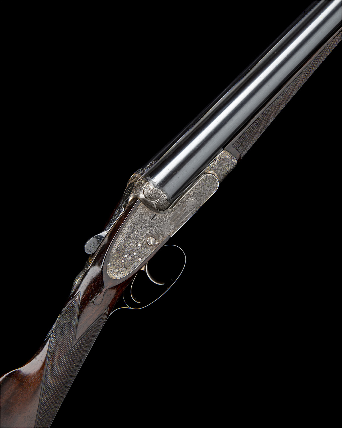 30in. Whitworth-steel nitro chopperlump barrels, the rib engraved 'J. WOODWARD & SONS. 64. ST. JAMES'S' STREET. LONDON. S.W. MADE OF SIR JOSEPH WHITWORTH'S FLUID PRESSED STEEL.', 2 1/2in. chambers, bored approx. 1/4 and 1/2 choke, arcaded fences with side-clips, removable striker discs, automatic safety with gold-inlaid 'SAFE' detail, protruding tumbler pivots with gold-inlaid cocking-indicators, profusely engraved with fine acanthus scrollwork, the rib, toplever and fore-end finial with small raised florally engraved ovals, retaining slight traces of colour-hardening (possibly historically renewed), 14 3/4in. well-figured stock including buttplate, chequering refreshed, weight 6lb. 10oz., in a brass-cornered oak and leather hammergun case with later Purdey trade label and gun specification label