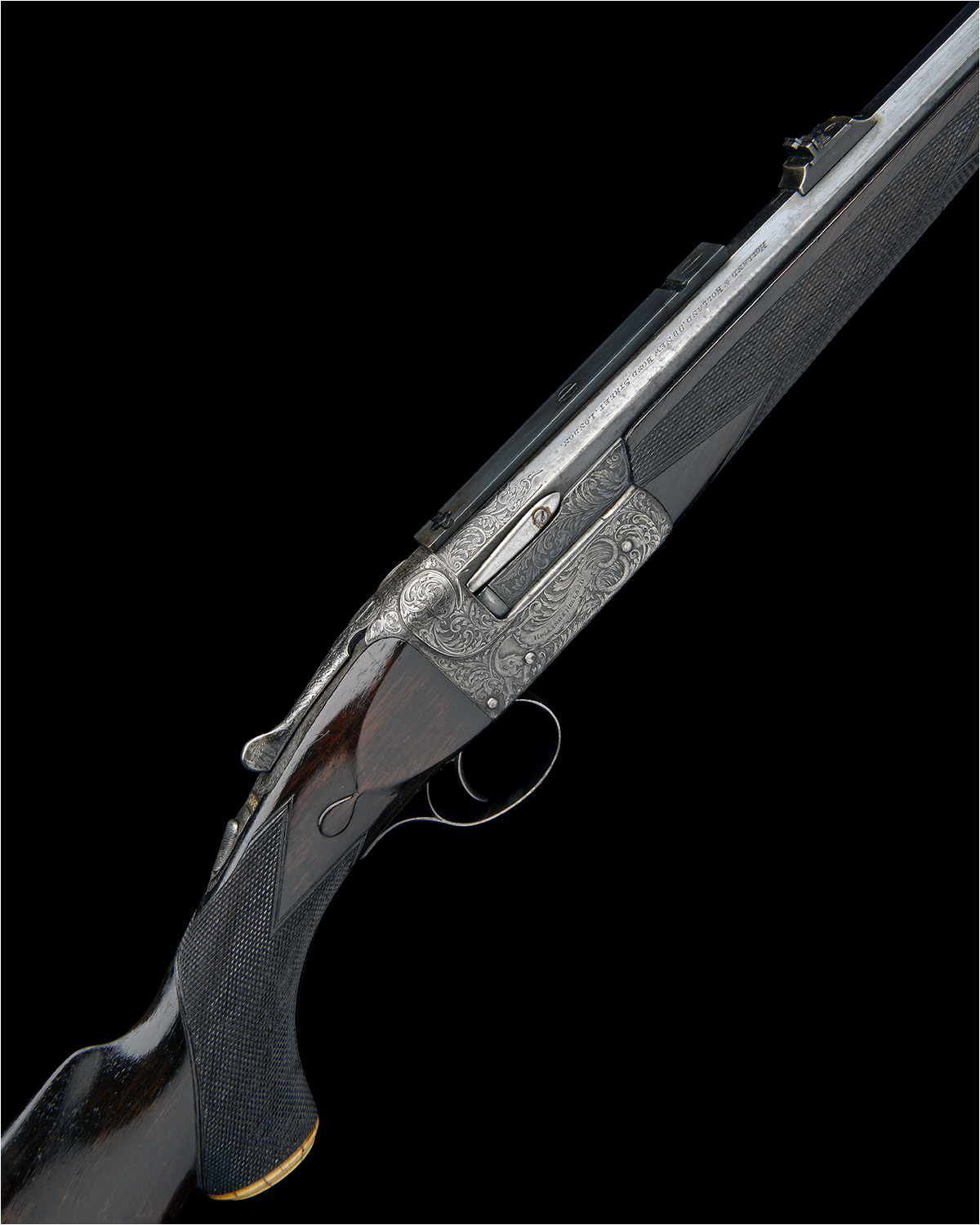 24 1/2in. nitro reproved octagonal barrel lined to .22 Hornet, partially file cut top flat with block-mounted open sights and folding leaf sights, block-mounted bead fore-sight, the breech end mounted with a Geco 4x telescopic sight on a quickly-detachable rail mount (later), the barrel engraved ' HOLLAND & HOLLAND. 98. NEW BOND STREET. LONDON. WINNERS OF ALL THE "FIELD RIFLE TRIALS". LONDON.', and '.295 SEMI SMOOTH BORE', the breech end and extractor housing carved in high relief with fine foliate scroll designs on a matted background, outsized action with teardrop fences, automatic safety with gold-inlaid 'SAFE' detail, removable striker disc, non-selective ejector, the action and furniture finely carved in high relief with fine scrolling foliate and acanthus motifs interspersed with mythical beasts of serpentine form, the underside and the standing breech with depictions of the Green Man, the triggerguard carved with a dragon, retaining very slight traces of original colour-hardening, 14 3/4in. highly-figured pistolgrip stock with cheekpiece, ivory pistolgrip-cap and buttplate, the fore-end with an ivory finial, weight 7lb. 4oz. (unscoped) and 8lb. 5oz. (with scope)
