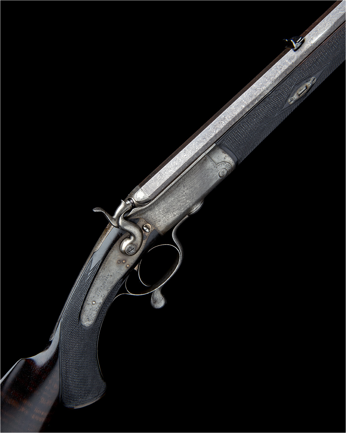 Provenance: The makers records list the rifle as being completed as a .450 single barrelled breech loading rifle on the 7th July 1879 for 1879 for Frederick Snowden Corrance, b1820. Resided at Broadwater, Framlingham.