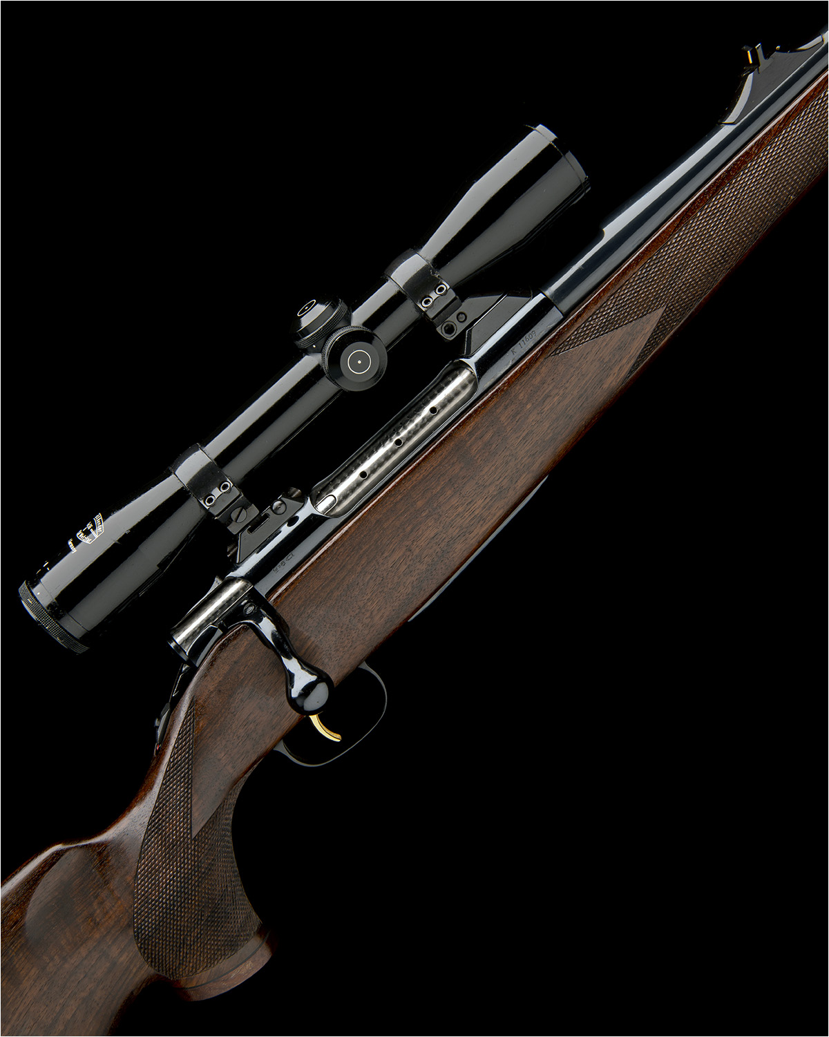 23 5/8in. nitro barrel with block-mounted open sights and ramp-mounted bead fore-sight, the receiver mounted with a Schmidt & Bender 4x36 telescopic sight, serial no. 55725, in quickly-detachable mounts, sprung tang-mounted safety, gold-washed set trigger, detachable box magazine, highly-figured pistolgrip stock with palm swell, cheekpiece and hogsback comb, sling swivels, 14 1/4in. pull including 1in. ventilated rubber recoil pad, weight 8lb. 1oz. (unscoped) and 9lb. 4oz. (with scope)