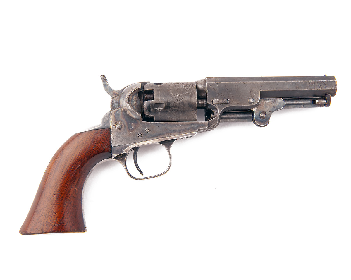 for 1861, with blued 4in. octagonal barrel (strong traces of finish), the top-flat signed 'ADDRESS COL SAML. COLT NEW-YORK US AMERICA', plain cylinder with roll engraved scene, colour-hardened open iron frame marked 'COLT'S PATENT', silver-plated brass grip-straps and trigger guard bow with much finish remaining, colour hardened articulated under-barrel rammer and smooth walnut grips
