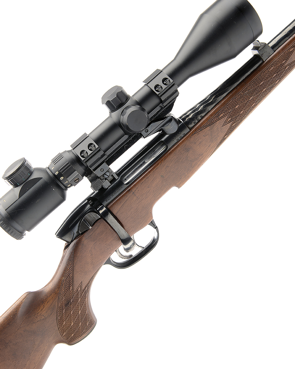 STEYR .222 REM 'MODEL SL' BOLT-MAGAZINE SPORTING RIFLE, serial no. 42337, 23 1/4in. fluted nitro barrel, ramp-mounted fore-sight (bead missing), block-mounted rear leaf sight, fitted with a Sutter 3-12x50E telescopic sight with quick release mounts, manual safety, turn-down butter knife bolt, detachable magazine (missing), set triggers, 14 1/2in. pistolgrip figured walnut stock (including recoil pad), sling swivels