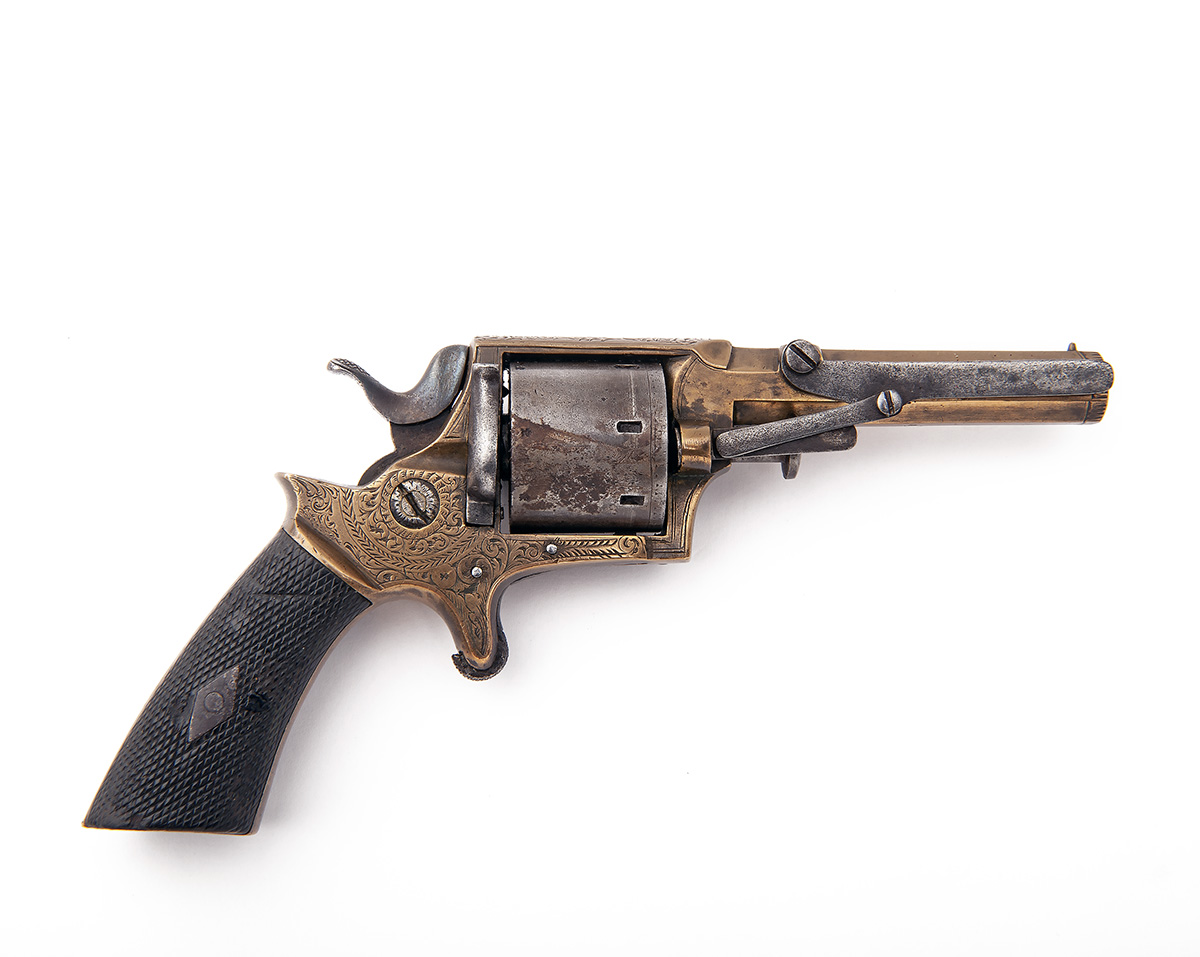 circa 1870, very similar in style to a Tranter Model 2 but with octagonal brass 3 1/2in. barrel signed on the top-flat 'MANTON, LONDON', bead fore-sight, plain iron cylinder with front locking notches and traces of engraving to the leading edge, border and scroll engraved brass frame with sprung cylinder release and compound linkage articulated ejector mounted on the right hand side of barrel, spurred hammer, sheath trigger, chequered walnut grips and exaggerated web to the back-strap