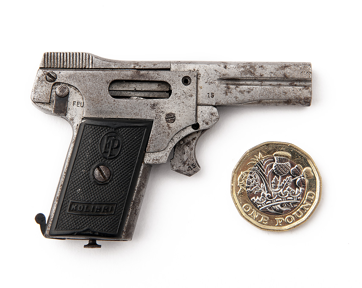 Provenance: The diminutive little Kolibri pistol is a world record holder twice over. Not only is it the worlds smallest central fire semi automatic pistol, it also takes the worlds smallest centre-fire round of ammunition. The brainchild of Austrian watchmaker Franz Pfannl and with financial help from Georg Grabner, it used flash powder as a propellant to increase apparent effectiveness and was only produced in very small numbers. It was not a commercial success.