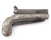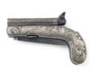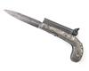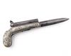 Belgian circa 1840, with round etched damascus 3 1/4in. side by side barrels, twin central hammers cupping the rear-mounted nipples, floral and shell engraved white metal pistol-grip bolsters, twin manually operated concealed folding triggers, spear-point 4 1/4in. knife blade mounted to the underside and folding into a cavity within the grip and black ebonite grip fills