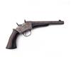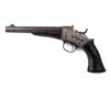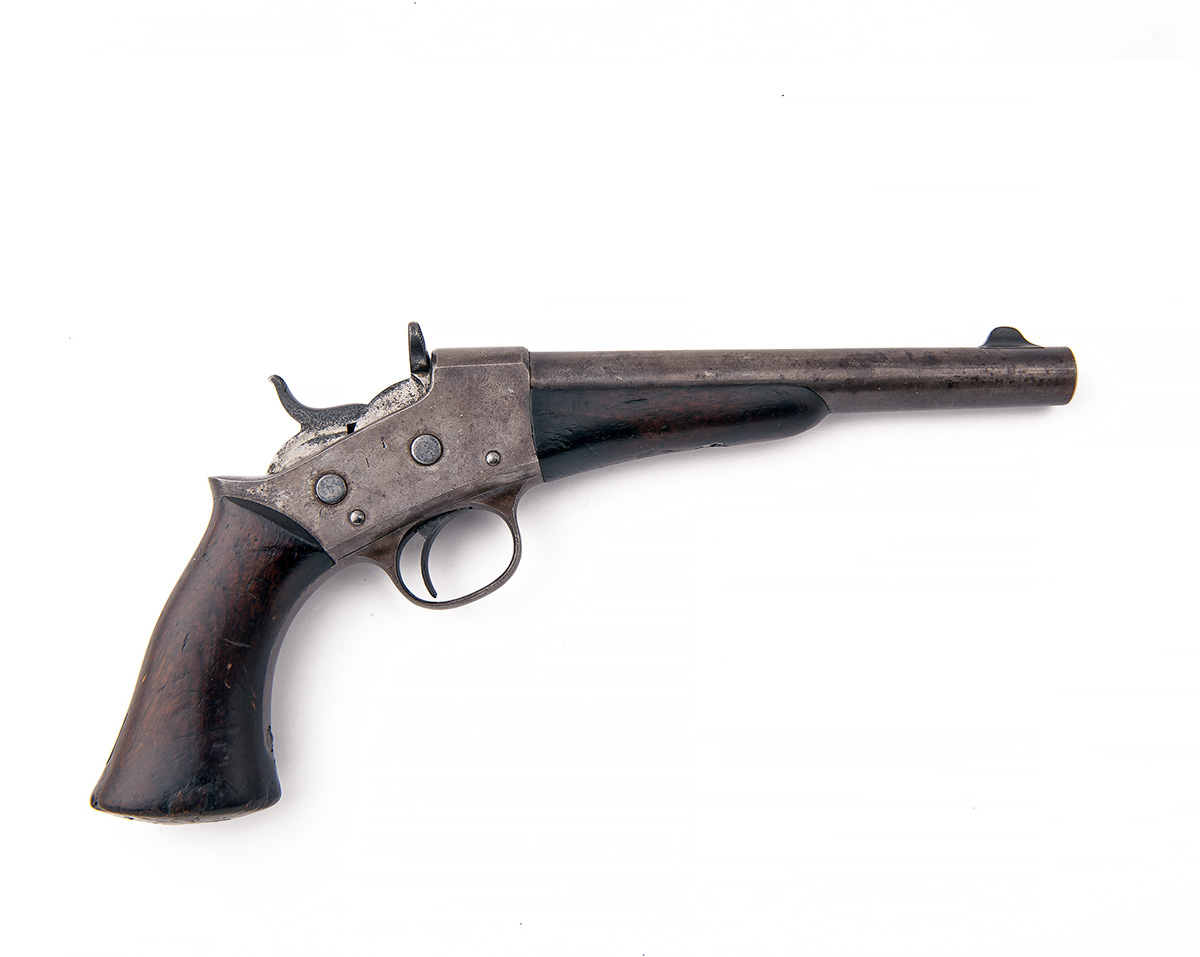 circa 1875, with tapering 7in. barrel, pinched blade fore-sight, sighting notch carved into top-edge of the rolling breech, central hammer, the left side of frame marked 'REMINGTONS ILION N.Y. U.S.A.' together with patents to 1866 and the letters 'P' and 'S', the right side plain, guarded trigger, smooth walnut flared grip and splinter fore-end, traces of finish