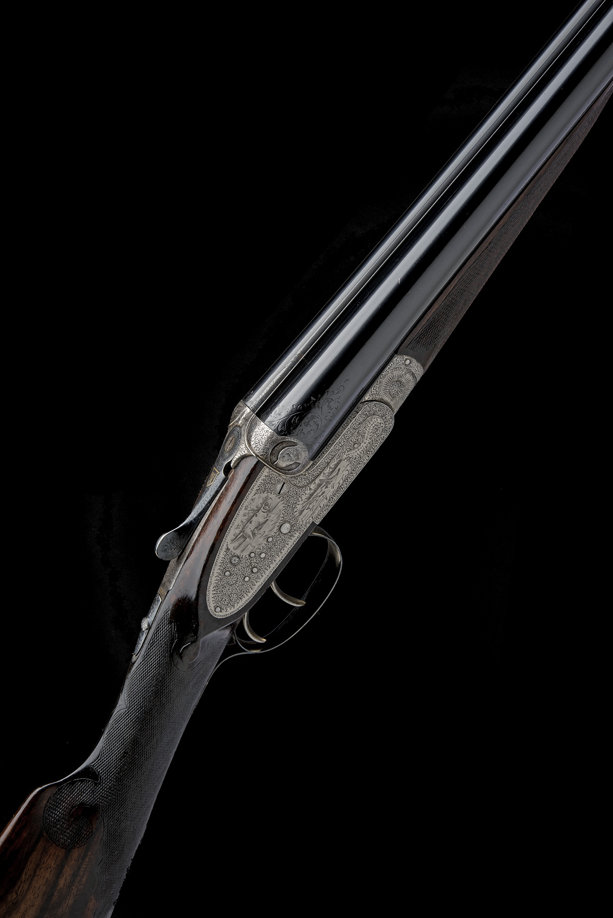 circa 1927, 28in. nitro reproved barrels (in 2025), the rib engraved 'HOLLOWAY & NAUGHTON LD. MAKERS BIRMINGHAM', the breech ends with acanthus scroll detailing, 2 3/4in. chambers, bored approx. imp. cyl. and 3/4 choke, left wall at 14, treble-grip action with hidden third bite and side-clips, the toplever engraved and gold-inlaid with a shield initialled 'H&N', automatic safety with gold-inlaid 'SAFE' detail, the fences carved in high relief with circular vignettes of dogs heads, the action, lockplates and furniture with fine acanthus scroll engraving surrounding game scene vignettes of hound and fowl, 14 1/2in. highly-figured stock (minor setting cracks) with ornately bordered chequering and horn buttplate, the fore-end wood carved en suite, weight 6lb. 5oz.
