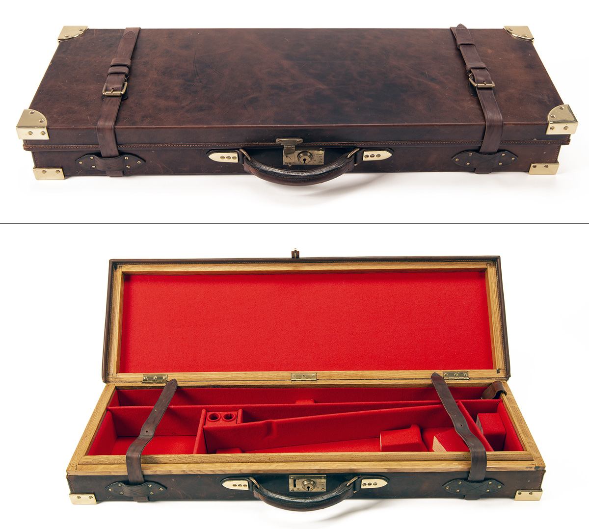 A BRASS-CORNERED OAK AND LEATHER SINGLE GUNCASE,