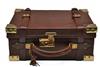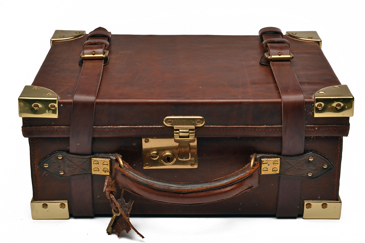 A BRASS-CORNERED LEATHER CARTRIDGE MAGAZINE,