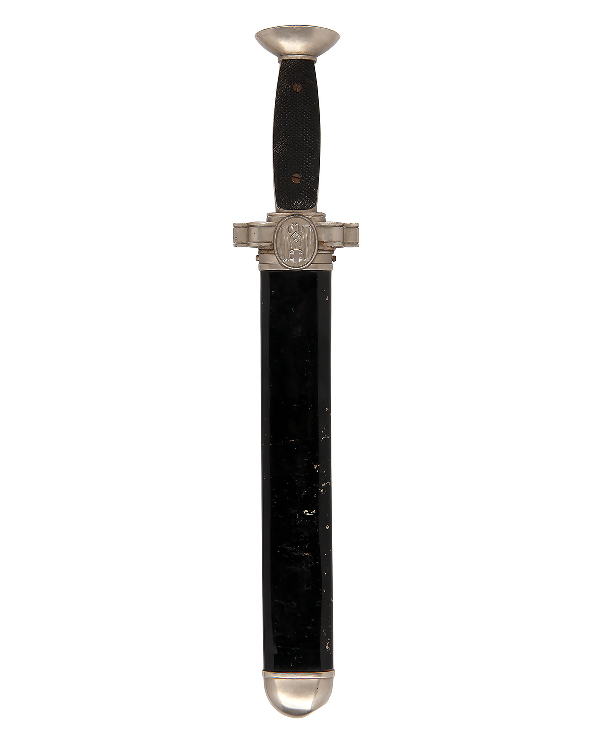 circa 1939, with heavy square-tipped 10 1/2in. saw-backed blade, plate tombak cross-guard with the DRK emblem in an oval (some age cracks forming), plated tombak hilt with flattened pommel and black bakelite chequered grip to front with smooth grip to reverse (mild discolouration to portions of blade), complete with its original black-painted steel scabbard with nickel mounts (dented at tip, minor losses to painted finish)