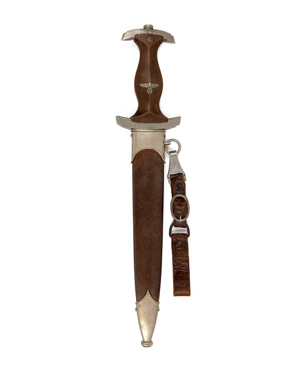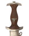 pre-war manufacture, with double-edged 8 1/2in. blade etched 'ALLES FUR DEUTSCHLAND' and with the makers mark to reverse, solid nickel furniture, the lower guard marked 'Wm' for the 'Westmark' region, shaped grip with inlet insignia (some mild bruising) and complete with its brown anodised metal scabbard with nickel fittings and attached leather belt hanger (some spotting to scabbard finish), scarce maker