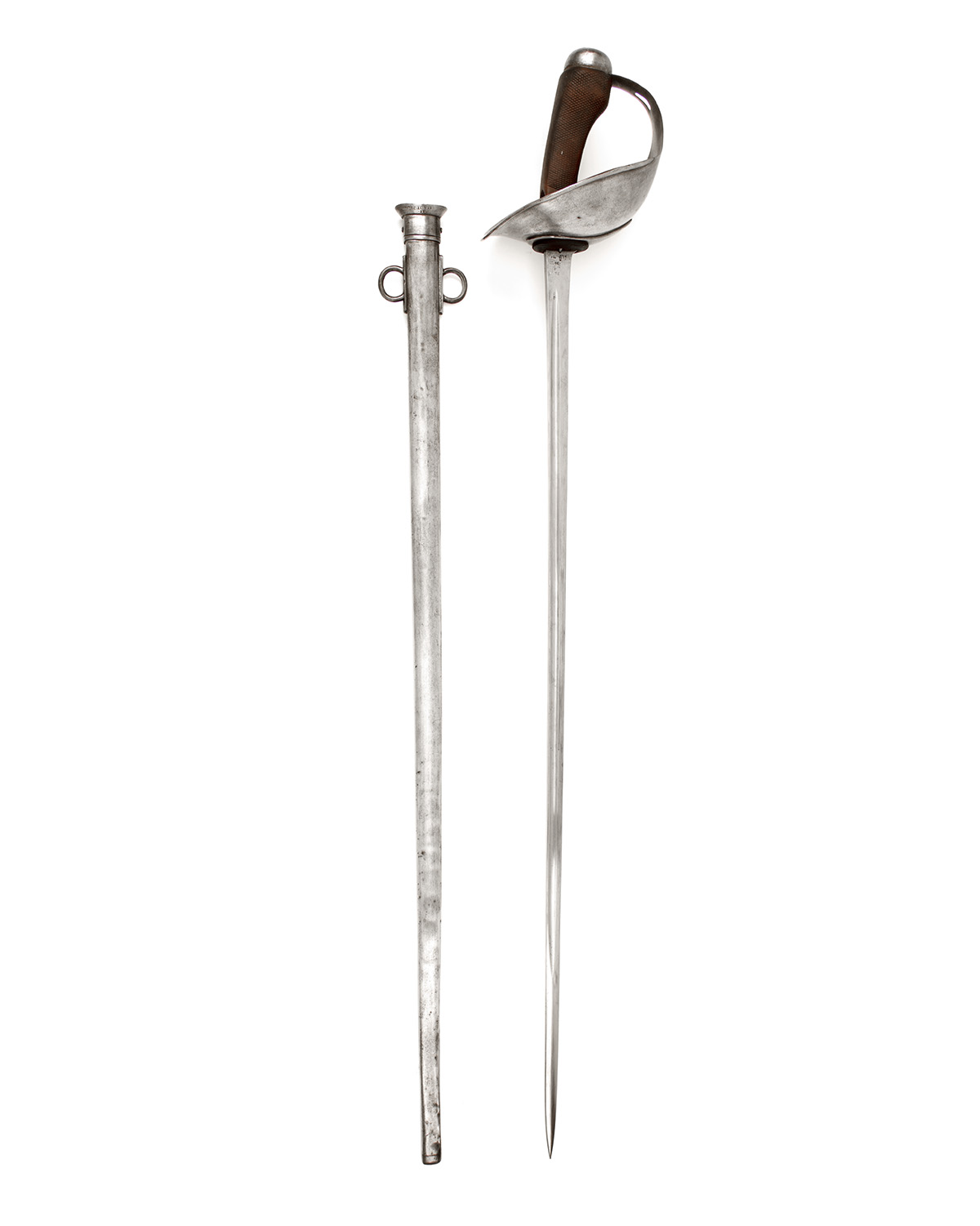manufactured by Enfield and dated for 1911 with further re-issue marks to 1934, narrow single edged and blind fullered 35in. blade, sheet iron bowl-style handguard with rolled edge, the inside stamped 'O.T.C.' over 'INN.CT.' over '12', composite material chequered 'pistol-grip' hilt and domed iron pommel, complete with its polished iron scabbard with twin fixed suspension rings