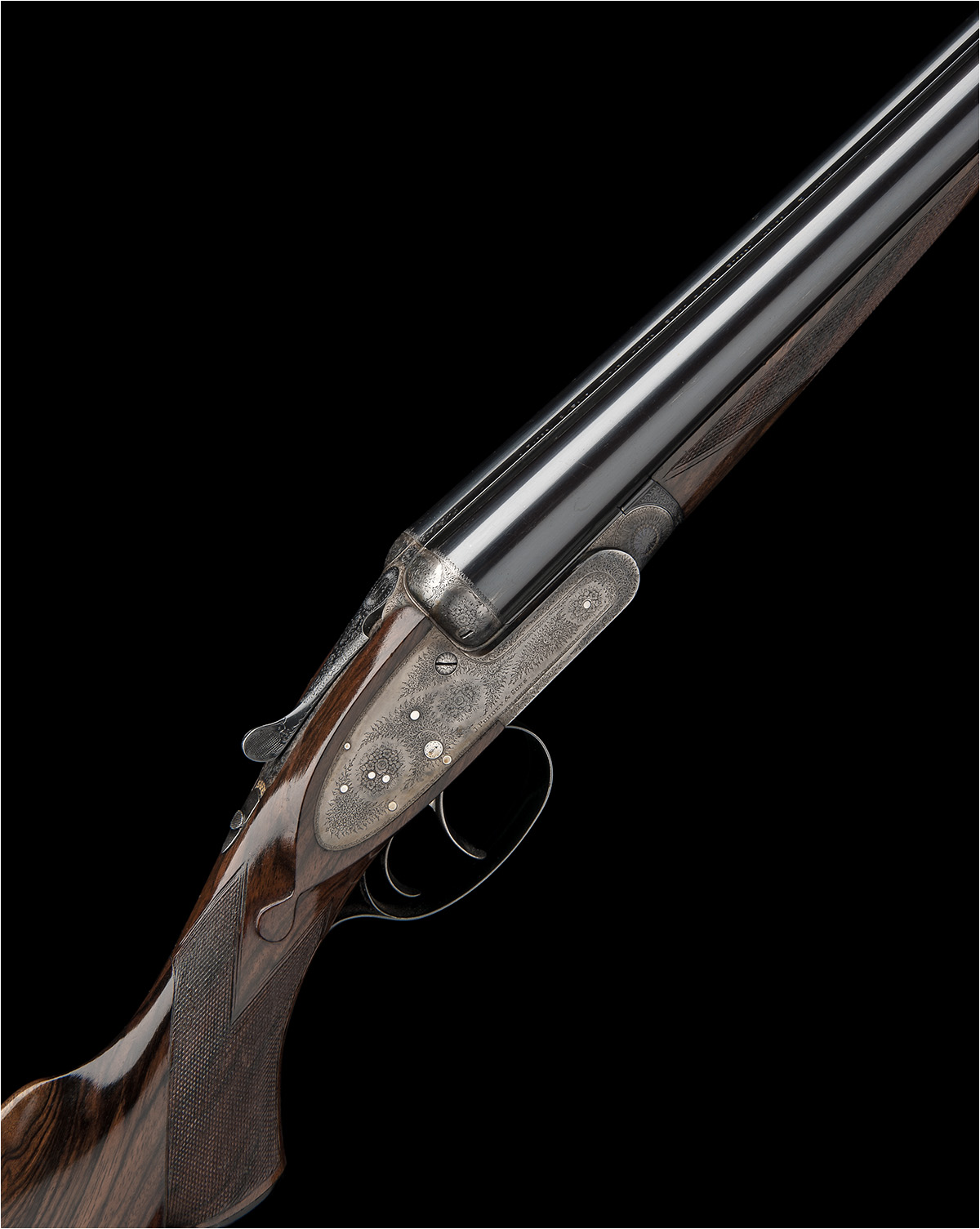 27in. replacement nitro chopperlump barrels, the rib engraved 'J. PURDEY & SONS. AUDLEY HOUSE. SOUTH AUDLEY STREET. LONDON. ENGLAND.', 2 1/2in. chambers, bored approx. imp. cyl. and 1/4 choke, automatic safety with gold-inlaid 'SAFE' detail, removable striker discs, arrow cocking-indicators, best fine acanthus scroll engraving with floral bouquets, the underside with a cartouche engraved 'J. PURDEY & SONS PATENT', retaining some renewed colour-hardening and finish, 14in. highly-figured semi-pistolgrip stock with pistolgrip-cap, matching fore-end wood, weight 6lb. 11oz., in a lightweight brass-cornered leather case with some accessories and a 1929 'Purdey Guns' booklet
