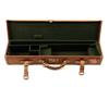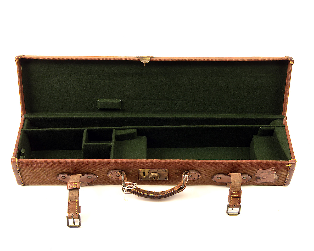 A BEIGE CANVAS AND LEATHER SINGLE TAKE-DOWN ROOK RIFLE / SINGLE BARREL GUNCASE, fitted for 25in. barrels, the interior lined with green baize, brass lock (including key)