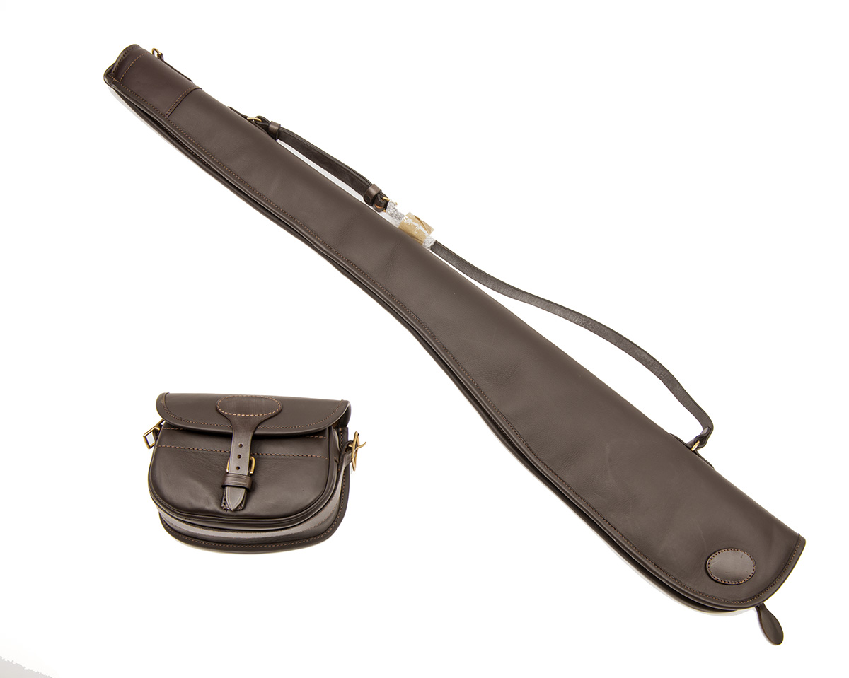 A FINE UNUSED BROWN LEATHER FLEECE-LINED SINGLE GUN SLIP WITH MATCHING CARTRIDGE BAG,