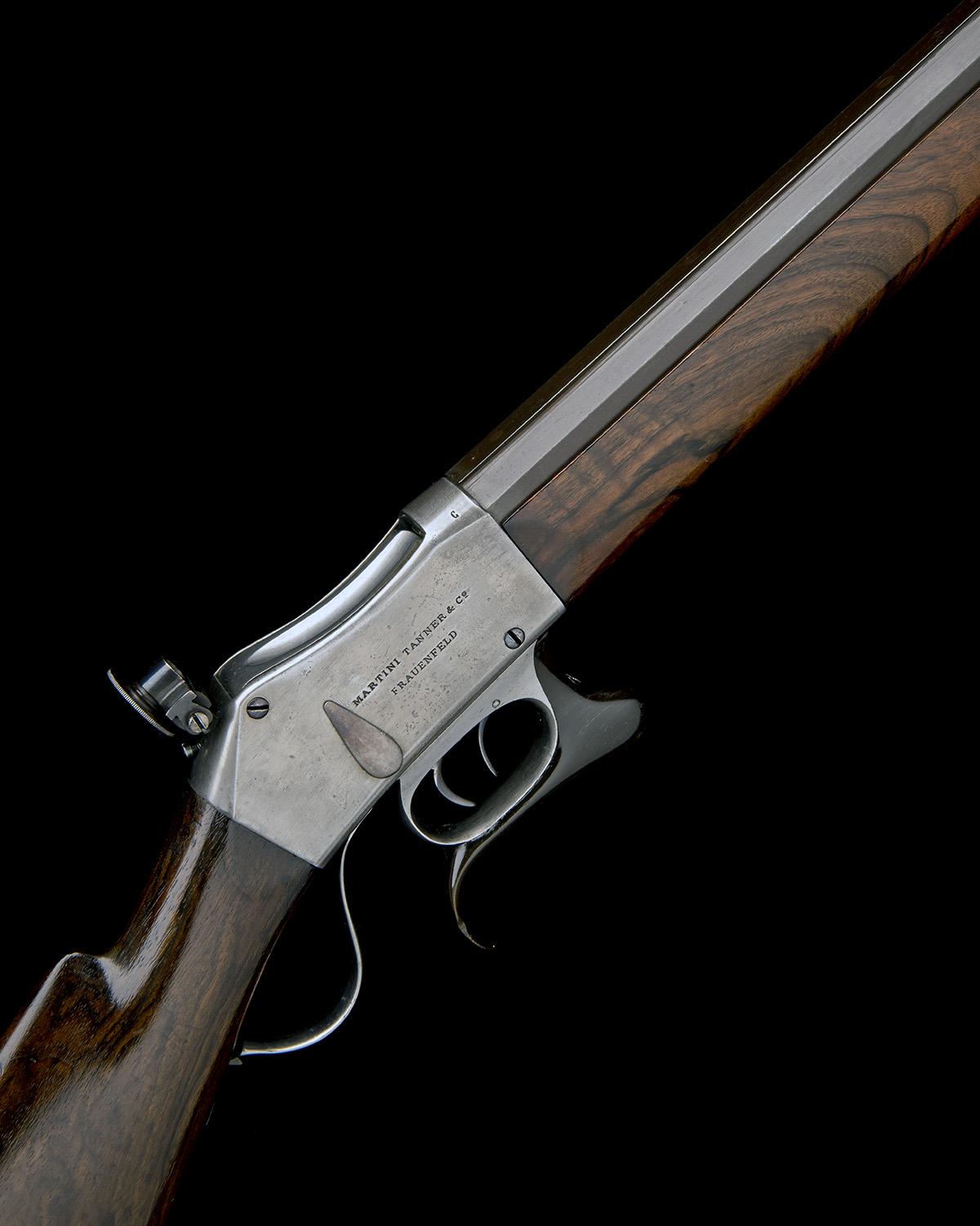 circa 1890, with heavy octagonal 31 1/2in. barrel, raised longitudinal dove-tail for the first third of the barrel for a rear-sight (absent), dove-tailed pillar fore-sight with side protectors, polished slab-sided receiver signed on the right 'MARTINI TANNER & CO, FRAUENFELD', the left side marked 'MARTINI'S PATENT 1704', adjustable pan-head peep-sight mounted to rear of action, walnut butt-stock with raised cheek-piece and iron Swiss-style heel-plate, iron finger-lever, complex moulded horn palm-rest to underside of trigger-guard bow, smooth walnut half-length fore-end with schnabel tip and held by a single cross-key and iron swivels