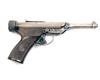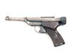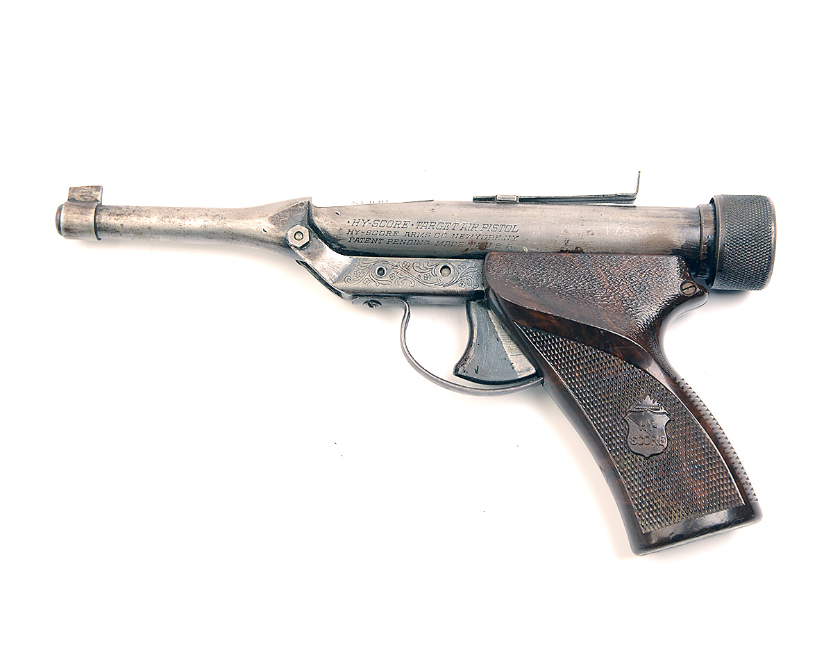 A .22 BARREL-COCKING AIR-PISTOL SIGNED HY-SCORE, MODEL '800 TARGET', serial no. 863463, with internal 10 1/2in. barrel, tapering shroud and concentric piston, loading tap to rear and engraved iron frame with brown wood effect bakelite grip, finish worn