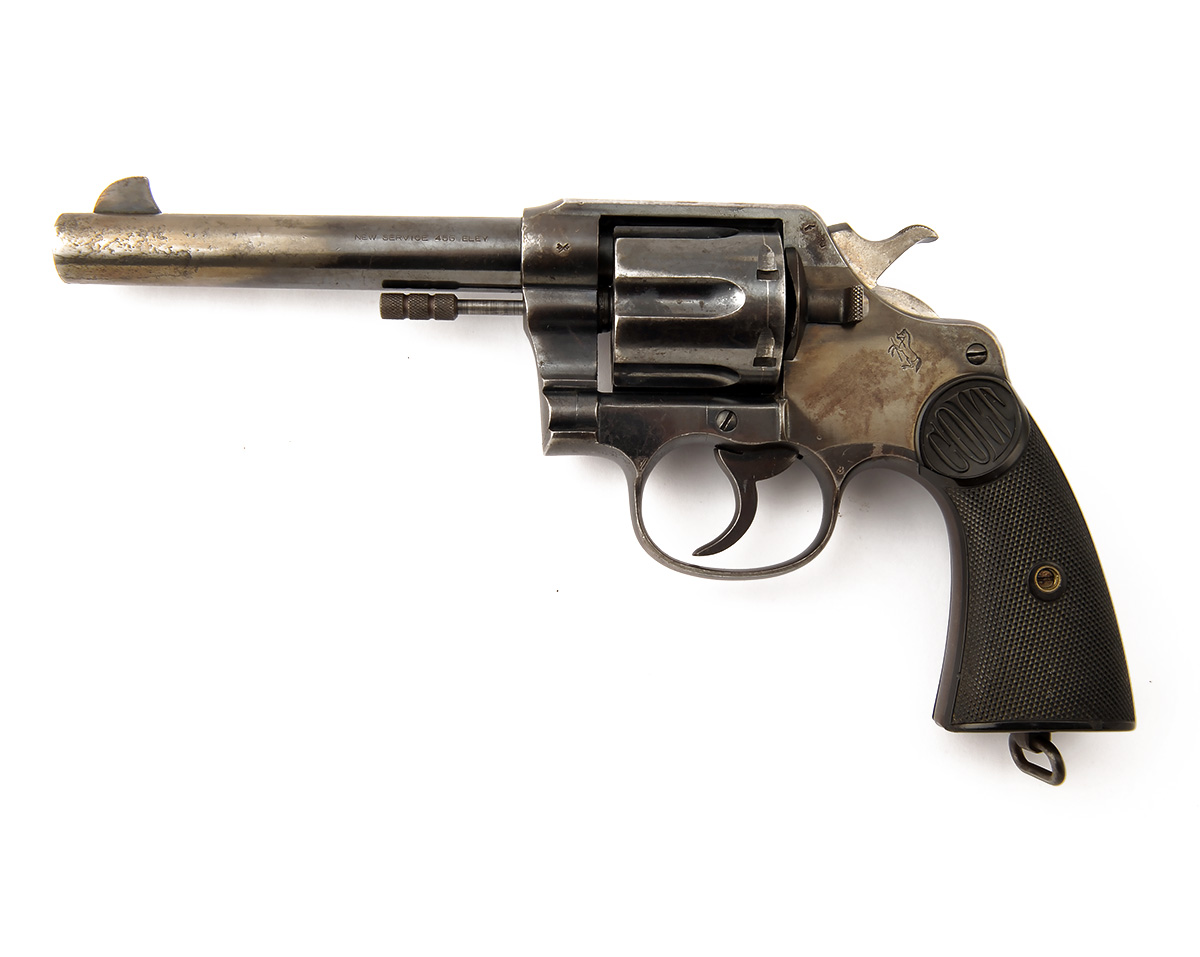 A .455 SIX-SHOT SERVICE REVOLVER SIGNED COLT, MODEL 'NEW SERVICE', serial no. 99592, for 1916, with 5 1/2in. barrel, swing out fluted cylinder, solid frame and chequered hard rubber grips, some loss to finish, one grip chipped