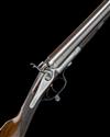 30in. nitro reproved damascus barrels (left wall at 17), the rib engraved '1' and 'BOSS & CO. 73. ST JAMES'S STREET. LONDON.', 2 1/2in. chambers, bored approx. true cyl. in both, carved percussion fences, rebounding back-action locks with dolphin hammers, fine border and acanthus scroll engraving, brushed bright finish, 14 1/4in. figured stock including steel buttplate, weight 7lb., in its makers brass-cornered leather case