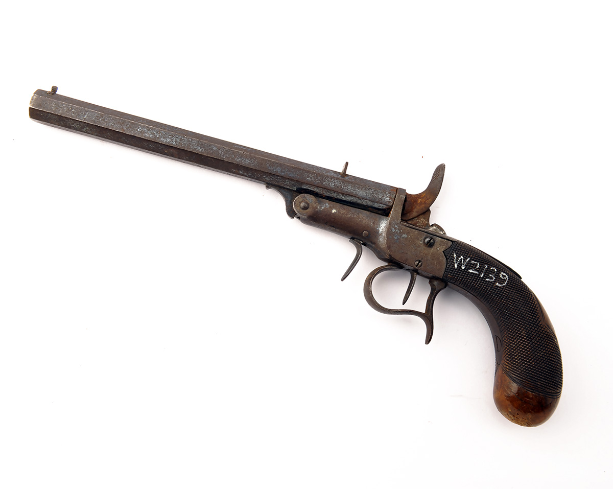 A .22 (FLOBERT) SINGLE-SHOT SMOOTHBORE PISTOL SIGNED VEISEY & SON, no visible serial number, with break open 7 3/4in. octagonal barrel, Flobert style breech, trigger barrel release, exposed hammer and chequered bag-shaped walnut butt, recommended parts only
