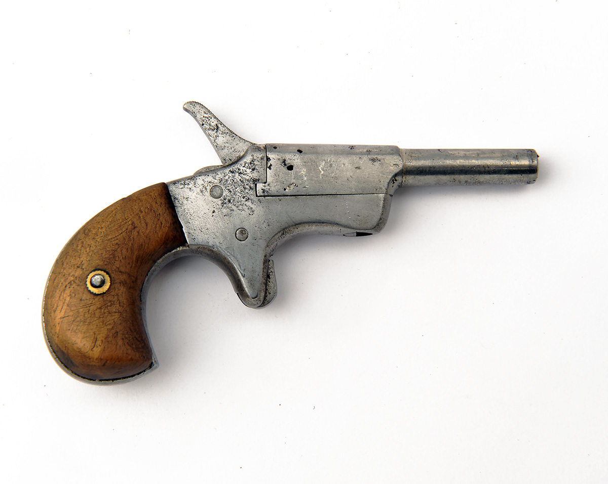 A 6mm (FLOBERT) SINGLE-SHOT SMOOTHBORED VEST-PISTOL, UNSIGNED, no visible serial number, Belgian circa 1870, with 2 3/8in. Colt style swing sideways to load barrel, exposed hammer, spur trigger and smooth birdshead wood grips, sold as parts only