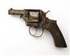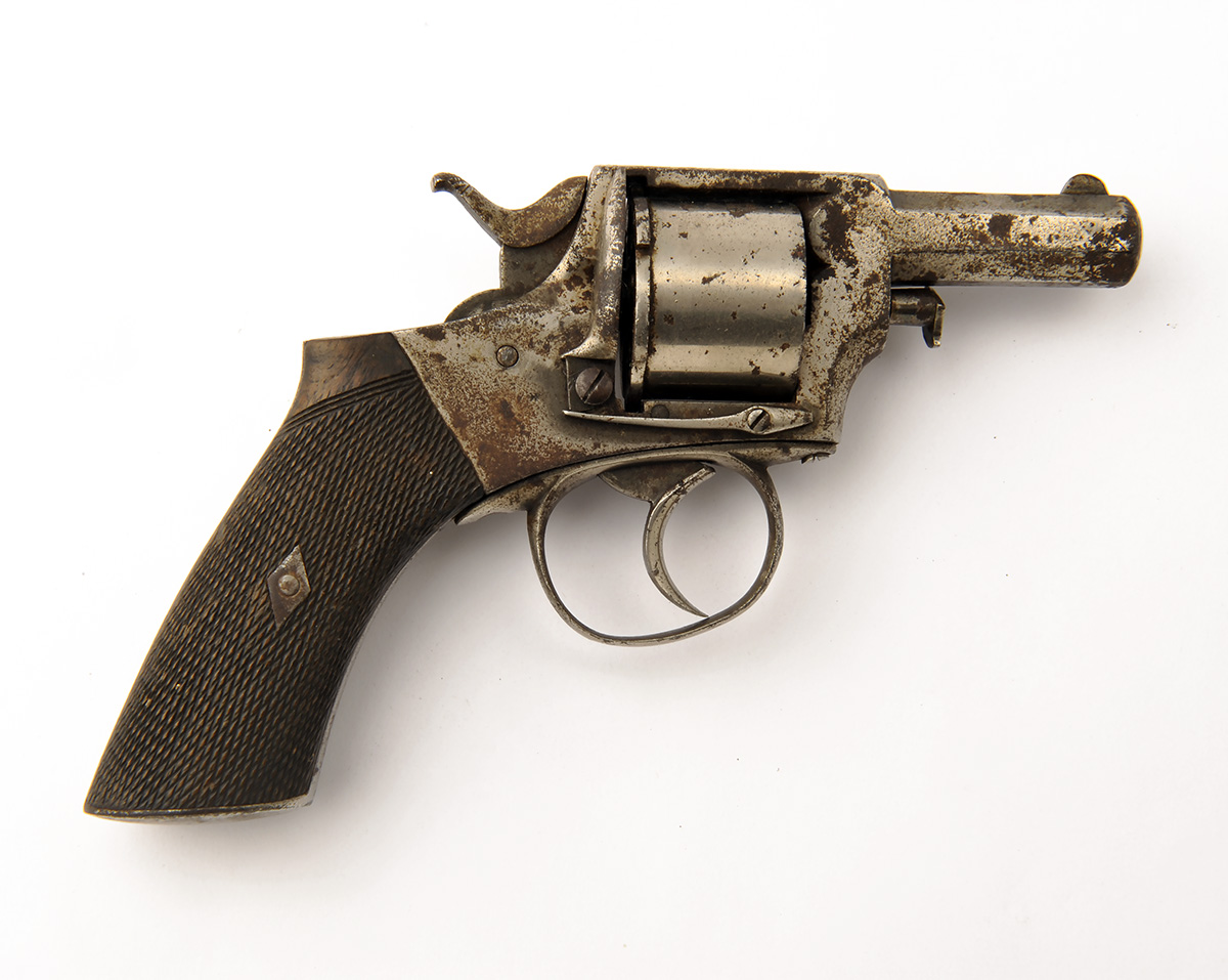 A .380 SIX-SHOT REVOLVER, SIGNATURE OBSCURED, MODEL 'BULLDOG TYPE', serial no. 4050, probably by Tipping & Lawden, Birmingham, with 2 3/8in. octagonal barrel, plain cylinder with external ratchet locking, solid frame with double action mechanism and semi saw-handled chequered walnut grips, traces of nickel-plated finish, recommended parts only
