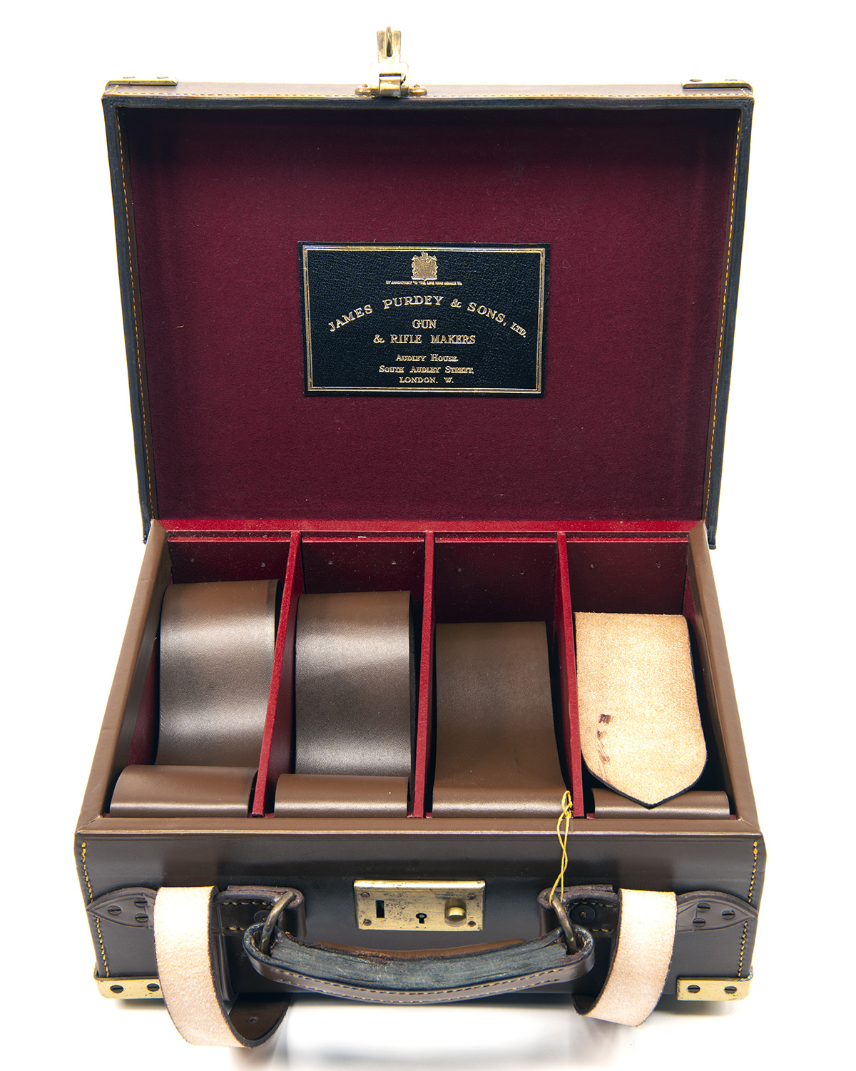 for approx. 200 cartridges, the interior lined with maroon baize and pigskin, a leather gold-tooled James Purdey & Sons trade label, brass lock (including keys)