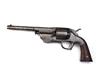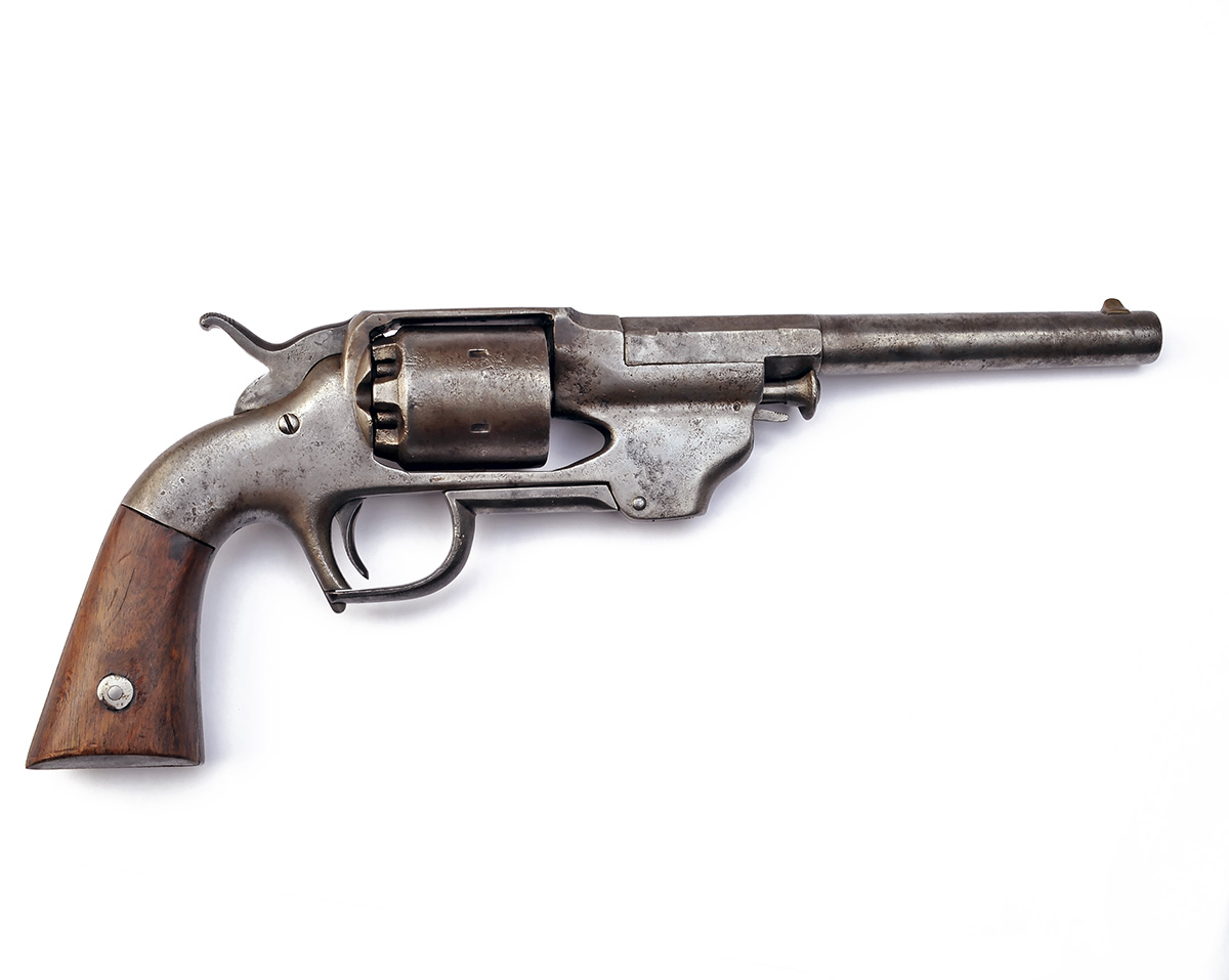 for 1861-62, with 7 1/2in. two-stage barrel (markings almost entirely erased), plain cylinder (external shallow pitting) with tapered and stepped nipple-wells, plain solid frame with frontal cylinder release and central hammer (top-strap repaired), smooth walnut grips, hinged ejection lever forming the trigger-guard, almost completely stripped of finish with some shallow pitting