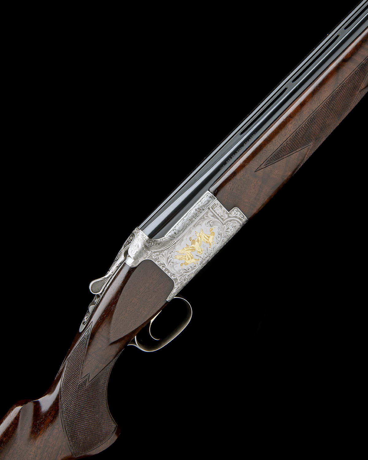 30in. nitro reproved barrels with 14mm ventilated matt top-rib, 2 3/4in. chambers, multichokes (with spares), hold-open toplevers, manual safety with integral barrel selector switch, adjustable gold-washed trigger, bold acanthus scroll engraving surrounding gold-inlaid game scenes of pheasant, duck, pointer and partridge, bright finish, 15in. figured pistolgrip stock including 3/8in. rubber recoil pad, weight 7lb. 10oz.