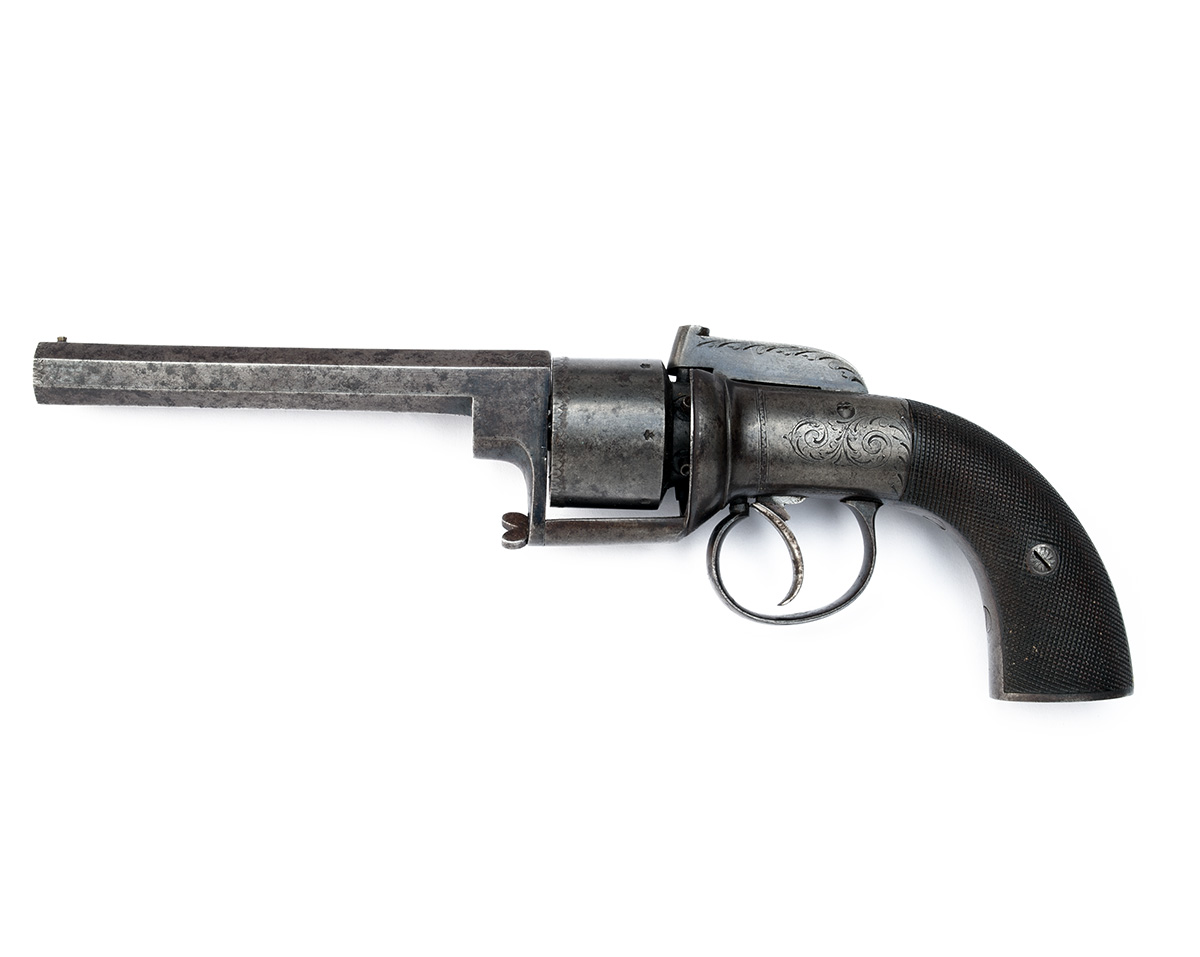 English circa 1840, with Birmingham proved octagonal 5 1/4in. barrel, bead fore-sight, open iron frame with wing-nut barrel removal, plain six-shot cylinder with engraved band to leading edge, moulded nipple shield, scroll engraved rounded central hammer boxlock action, finely chequered walnut grips and engraved flat iron heel-plate, in its original walnut storage case lined and compartmented in green baize (some mothing) and containing a period flask, mould with load lever combined and a later nipple-pot, escutcheon missing from lid