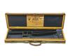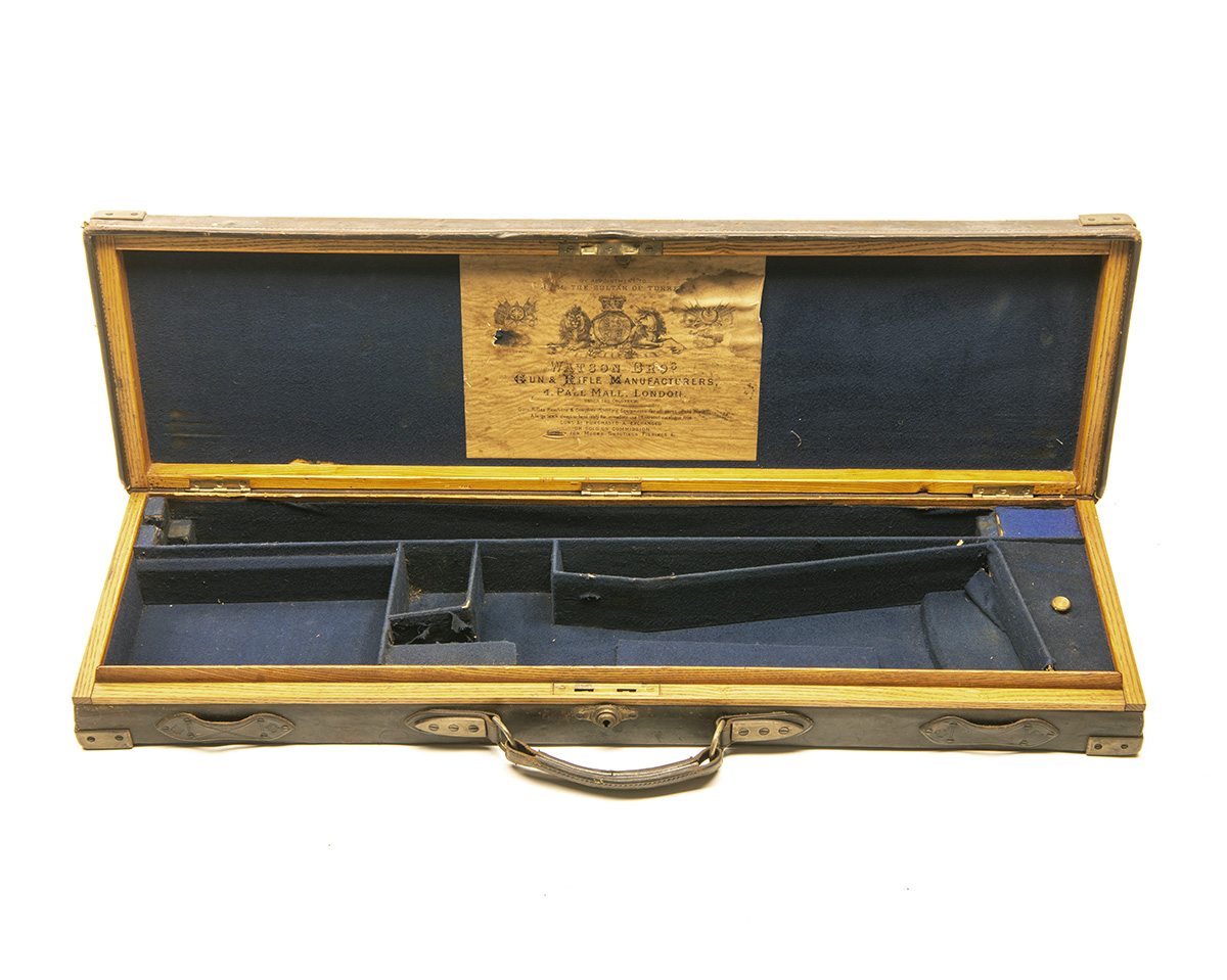 fitted for 28in. barrels (could adjust to 30in.), the interior lined with blue baize, a Watson Bros. trade label, brass lock (key missing)