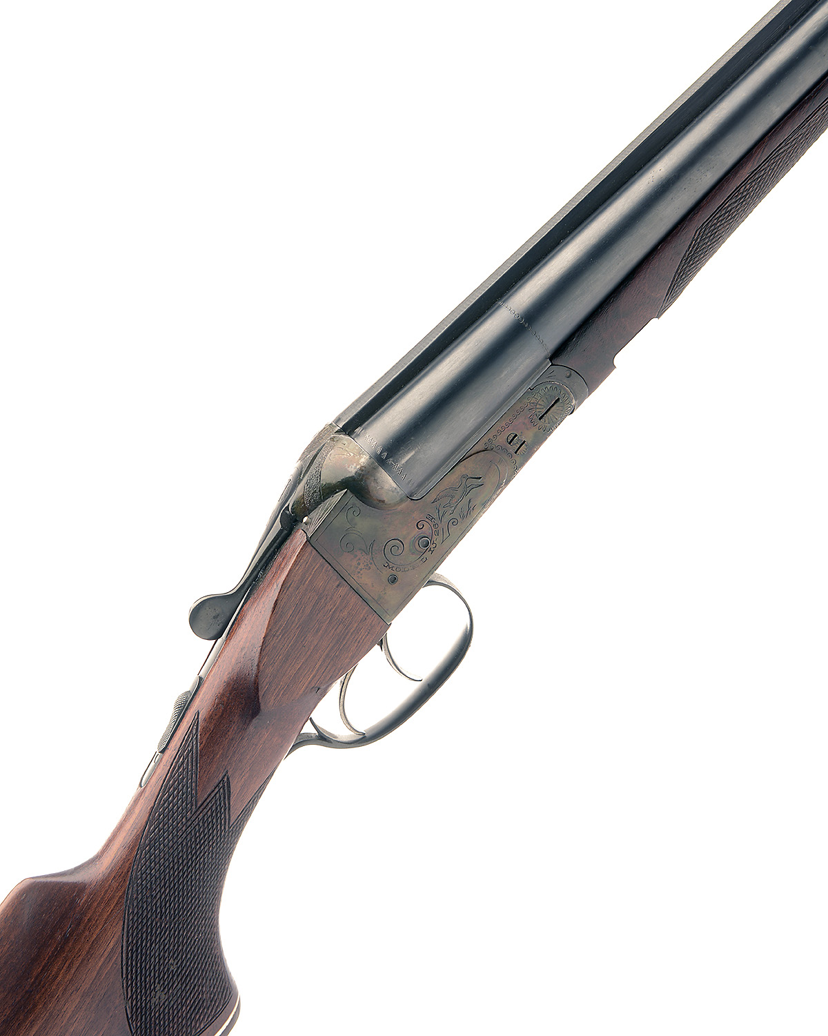 BAIKAL 12-BORE BOXLOCK EJECTOR, serial no. P00720, 27 3/4in. nitro barrels, 2 3/4in. (magnum) chambers, bored approx. imp. cyl. and 1/2 choke, treble-grip action with hidden third bite, cocking indicators, automatic safety, border engraving surrounding game scenes, retaining much original colour-hardening and finish, 14 3/4in. pistolgrip stock with sling swivels, including buttplate