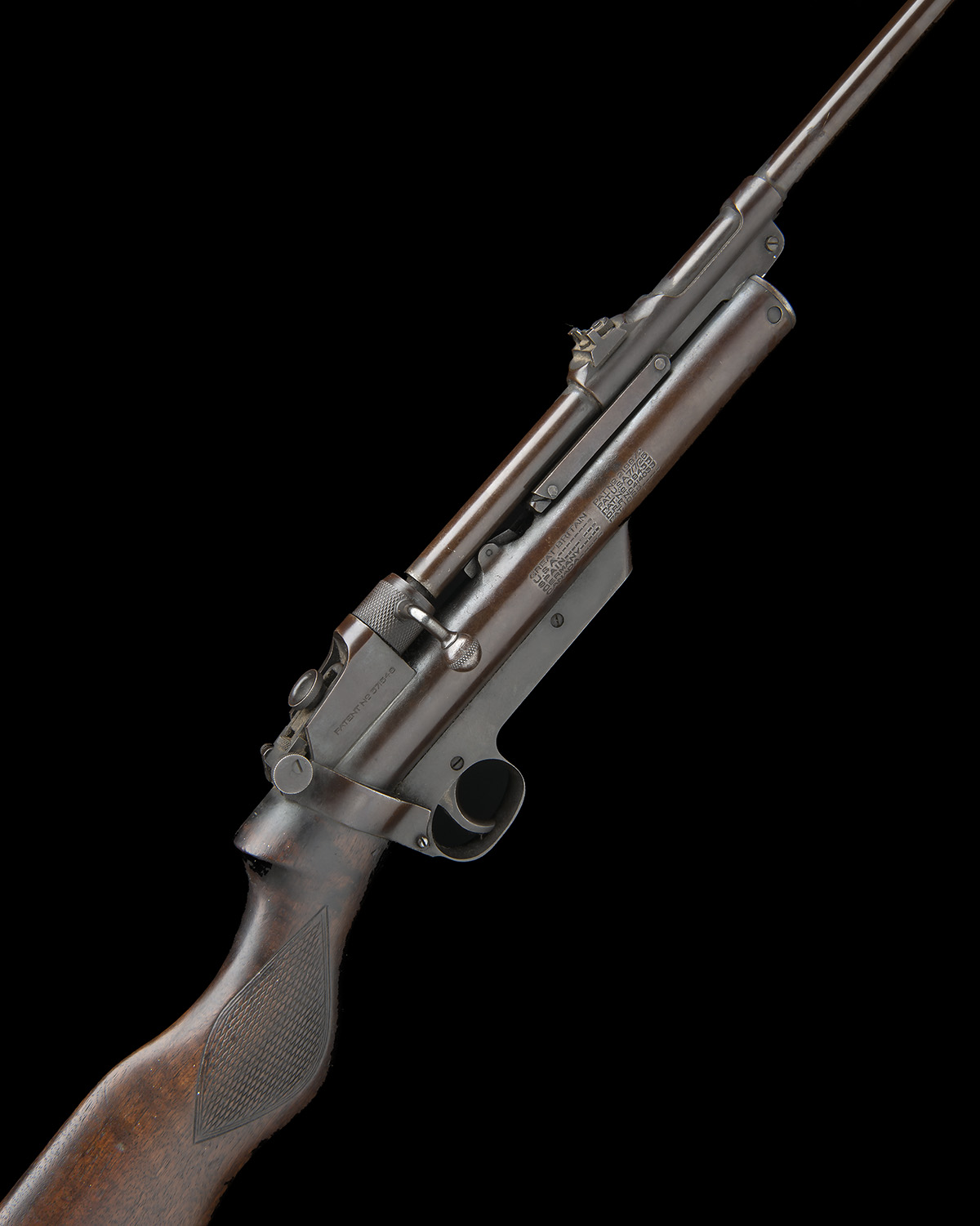 circa 1936, with matching number 25 1/2in. detachable barrel, ramp and dove-tailed blade fore-sight, elevating notch rear-sight, rotating bolt-action locking catch, peep-sight at wrist, air-chamber with patent markings and model details, trigger unit with maker's details and no provision for safety catch, chequered walnut saw-handled butt-stock, horn heel-plate and no provision for fore-end, finish stained to plum brown