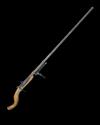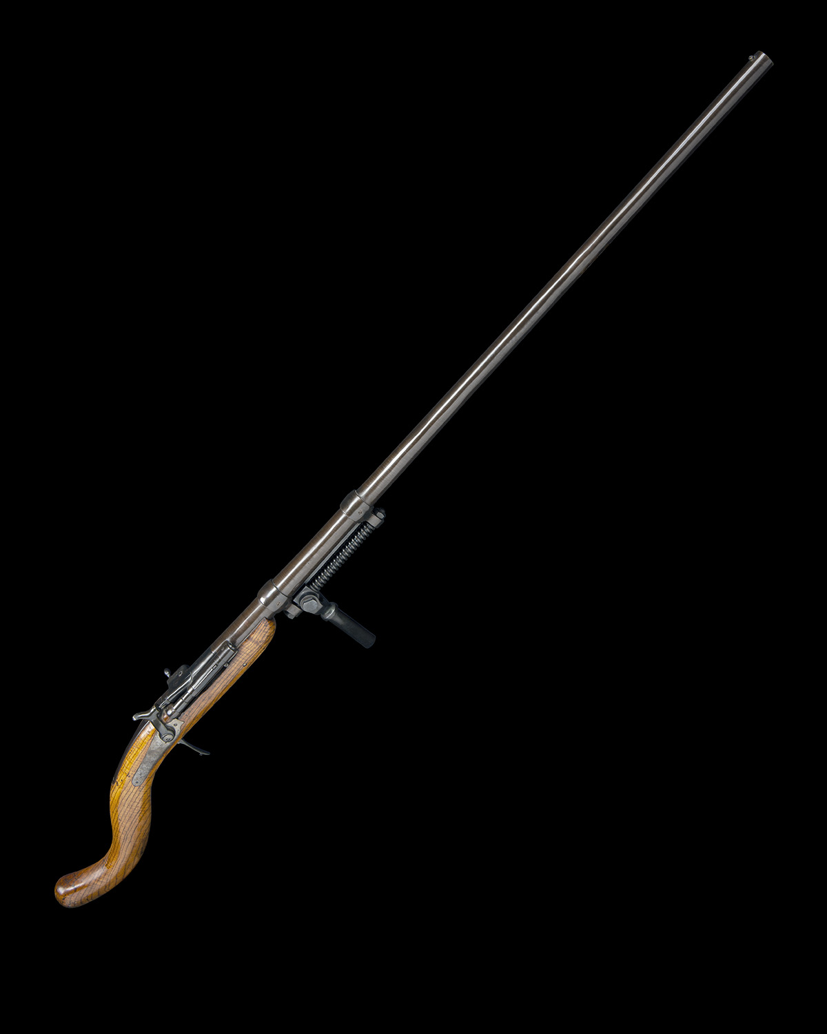 circa 1880, with browned round slightly tapering 56in. laminated barrel, reinforced breech section with substantial swing-open breech-block locking on a lever and marked with both Jones's and Snider's trademarks, the underside of block signed 'Wm. JONES, BIRMINGHAM', back-action lock and moulded hammer (traces of colour), heavy teak half-stock with rounded tiller butt, exposed long folding trigger-blade with eyelet for lanyard release and spring-loaded swivel-mount forwards of the fore-end operating along a guide rail, much possibly original finish throughout
