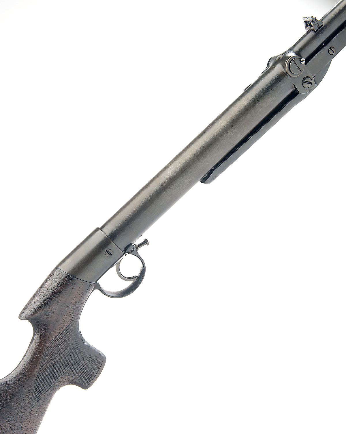 first production year, 1905, with sighted 19 1/4in. barrel, plain air-chamber stamped with make and model, saw-handled walnut butt-stock and 'spade' under-lever catch, finish frosted and stained