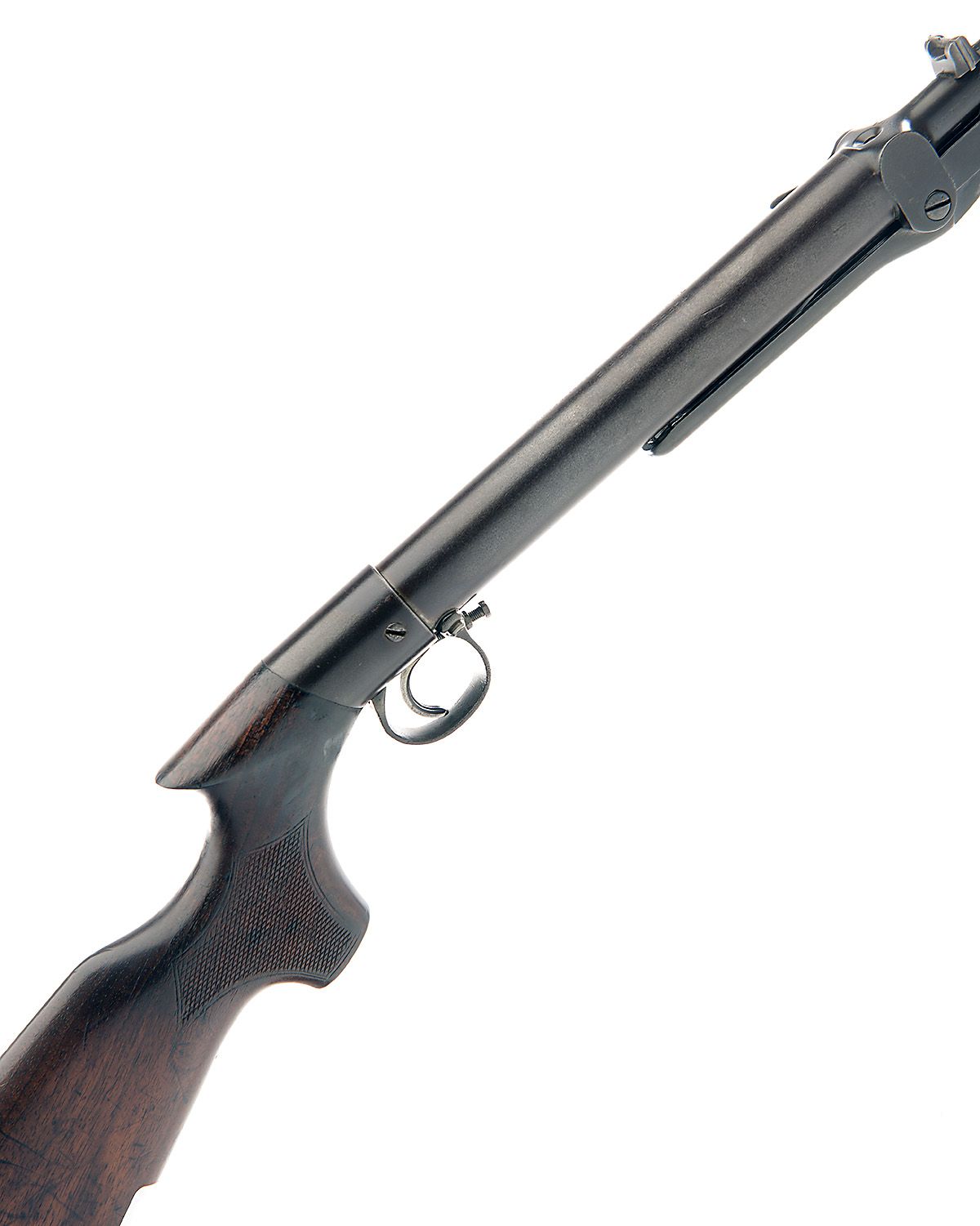for 1913, with sighted 19 1/4in. barrel, tap-loading breech, air-chamber with stamped make and model details, walnut saw-handled butt-stock and side catch under-lever, traces of finish