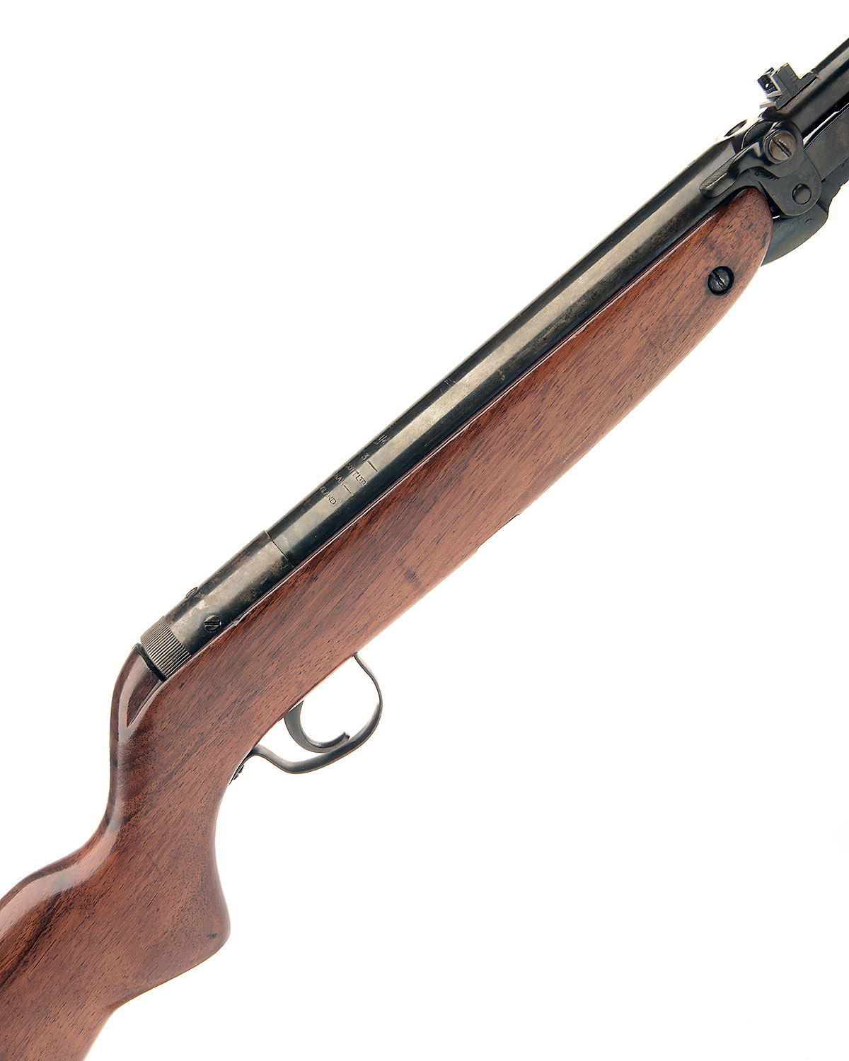 with 18 1/2in. barrel, moulded loading tap, plain air-chamber without telescopic sight rail, replacement walnut half-stock from a later model, re-finished