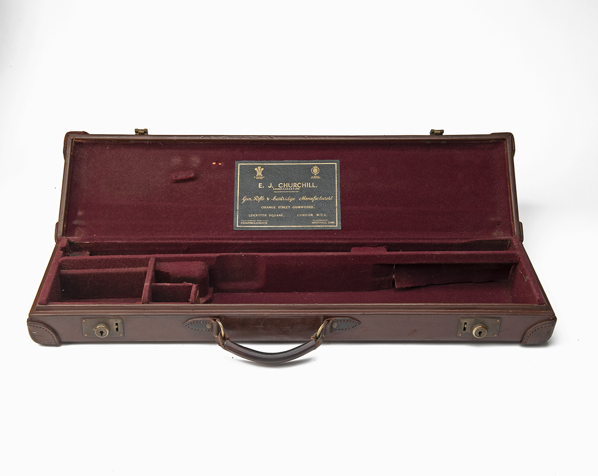 fitted for 25in. barrels, the interior lined with maroon baize, an E.J. Churchill trade label, brass lock (key missing)