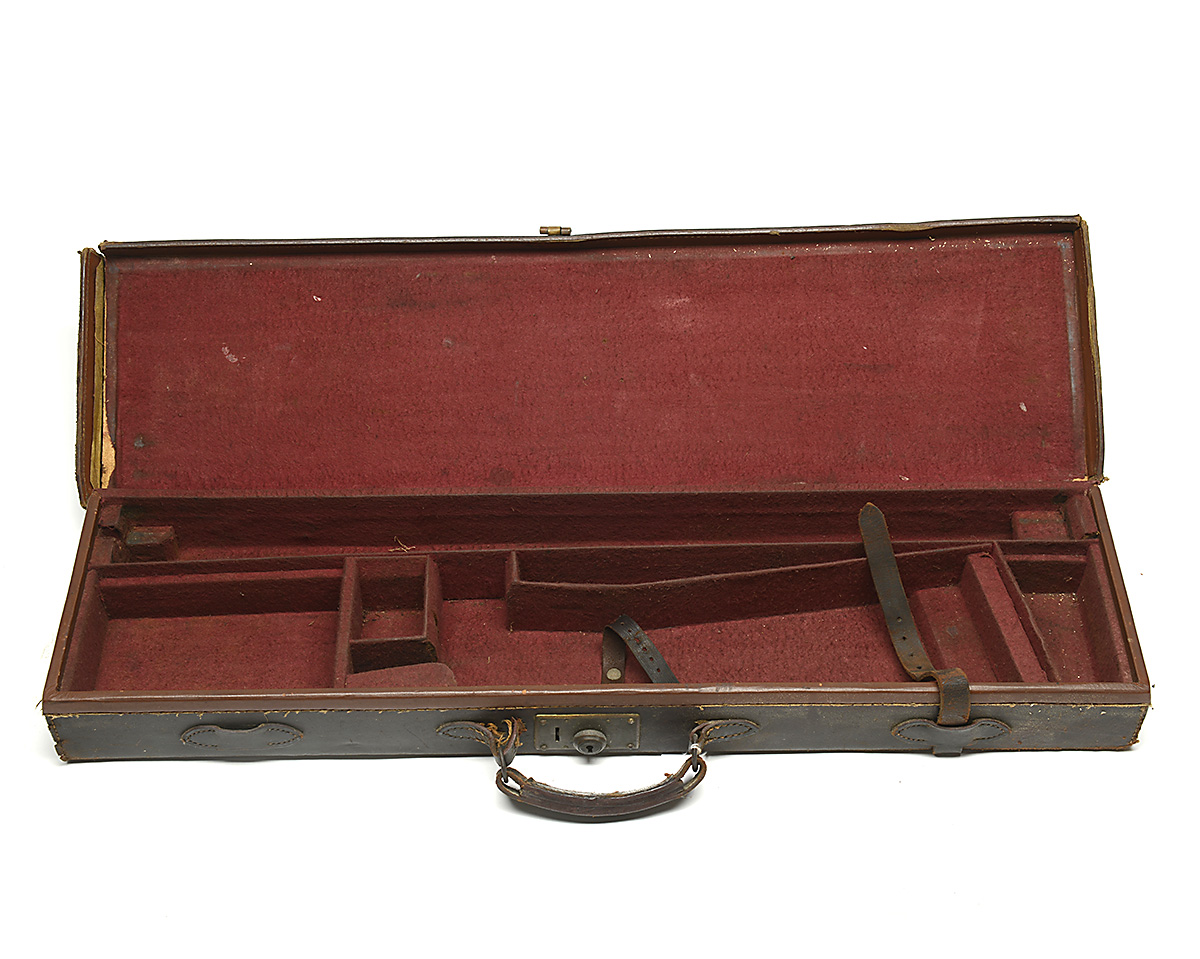 A LEATHER SINGLE GUNCASE, fitted for 30in. barrels, the interior lined with maroon baize, brass lock (including key), handle needs attention