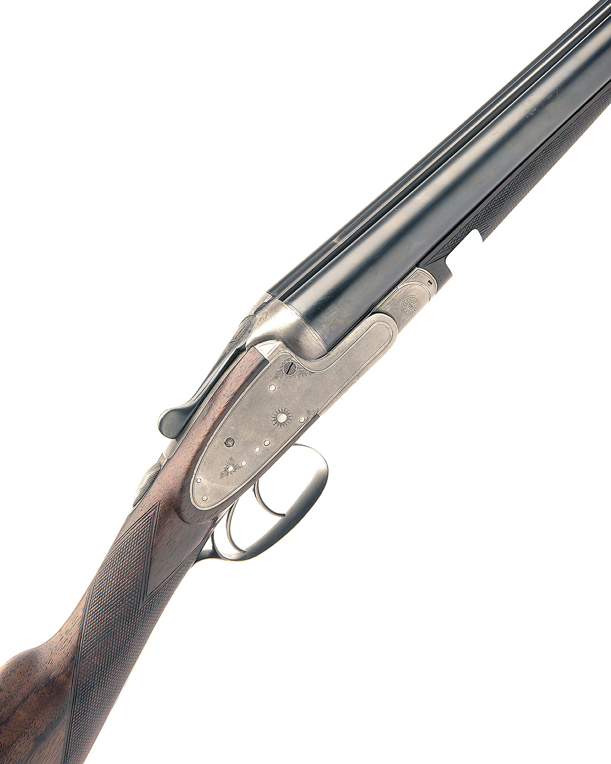CHARLES LANCASTER 12-BORE SIDELOCK EJECTOR, serial no. 11862, 30in. nitro barrels, the underside with the Webley 'winged bullet' trade mark, the rib engraved 'CHARLES LANCASTER'S W & R PLAIN HAMMERLESS EJECTOR', 2 1/2in. chambers, bored approx. imp. cyl. and 3/4 choke, treble-grip action with removable striker discs, automatic safety with brass 'SAFE' plaque, border engraving, retaining very slight traces of colour-hardening and finish, 15 3/4in. stock including 2in. wooden extension, weight 7lb. 1oz.