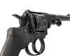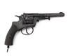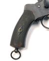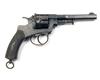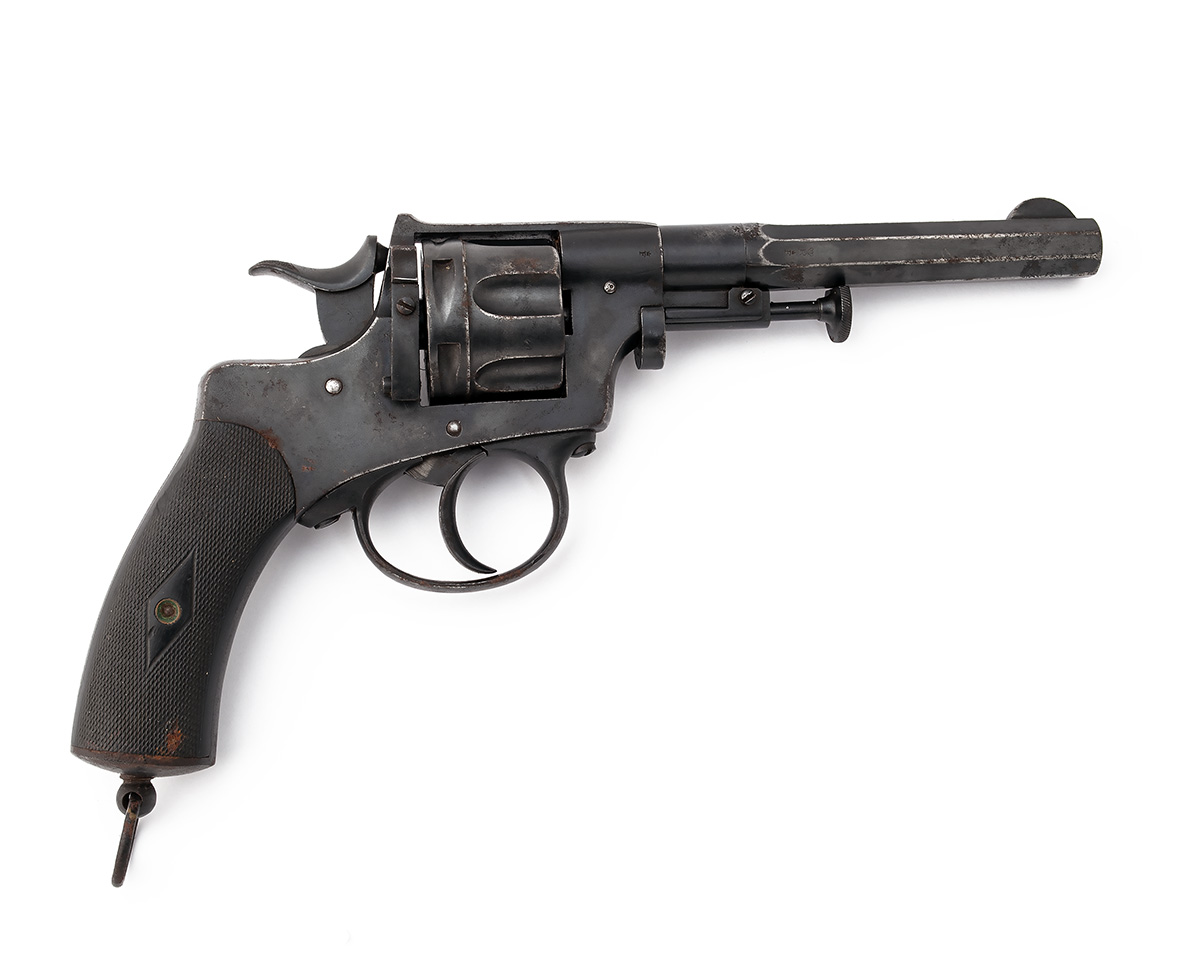 Belgian proved circa 1875, with 5 1/2in. octagonal barrel marked 'ACIER FONDU', crescent fore-sight, rounded breech with swing-out ejector, fluted slightly stepped cylinder, solid frame (not field strippable), double action mechanism with spurred hammer, finely chequered dark wood grips and lanyard ring at heel, some staining and small areas of light pitting over original finish