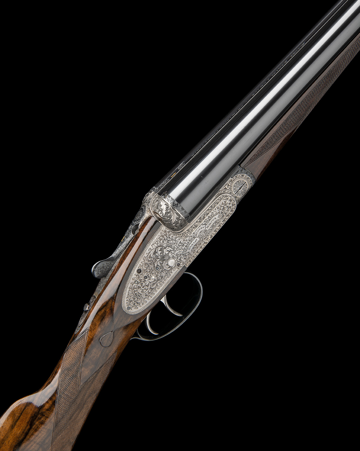 29 1/2in. nitro chopperlump barrels, the rib engraved 'HENDRY, RAMSAY & WILCOX, 55/57, Nth. METHVEN STREET. PERTH.' and gold-inlaid '1' at the breech end, 2 3/4in. chambers, bored approx. 1/4 and 1/2 choke, Iberian Holland & Holland style self-opening action, toplever gold-inlaid '1', automatic safety with gold-inlaid 'SAFE' detail, removable striker discs, articulated front trigger, rolled-edge triggerguard, the tang gold-inlaid with the serial number, beaded border and acanthus scroll engraving surrounding a centrally carved motif of a Scottish thistle, the fences carved in relief with thistles set against a matt background, the underside of the action with the makers logo within a roundel, the triggerplate initialled 'D.S.', brushed finish, 14 3/4in. figured stock, weight 7lb. 3oz., in its makers tan leather guncase