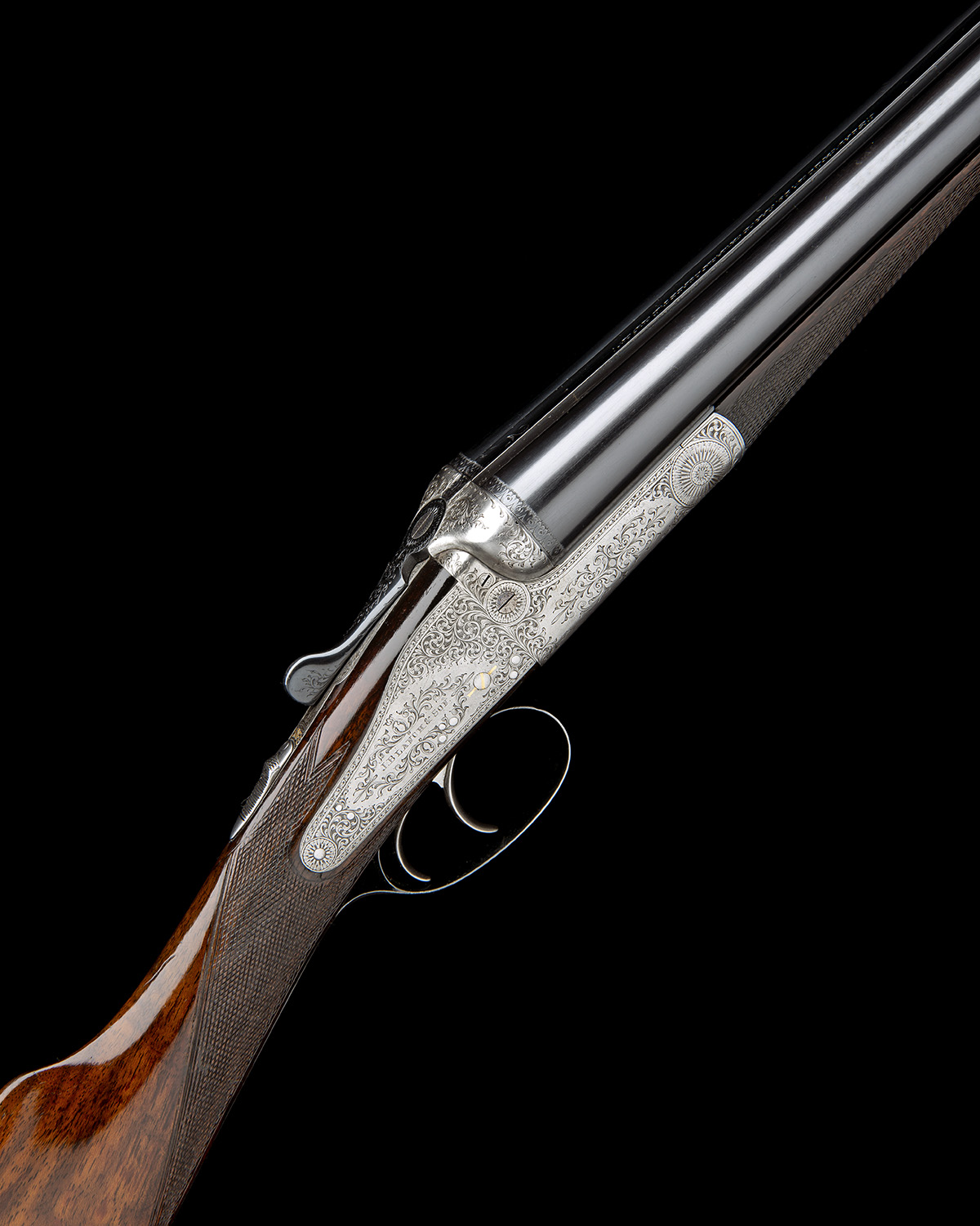 26in. replacement nitro barrels, the rib engraved 'J. BLANCH & SON. 29. GRACECHURCH STREET. LONDON.' and engraved '2' at the breech end, 2 1/2in. chambers, bored approx. imp. cyl. and 1/2 choke, treble-grip action, gas checks, automatic safety with gold-inlaid 'SAFE' detail, back-action lockplates, gold-inlaid cocking-indicators, border and acanthus scroll engraving, brushed bright finish, Blanch Improved snap bolt fore-end release, 14 3/4in. stock including 7/8in. wooden extension, weight 6lb. 5oz.