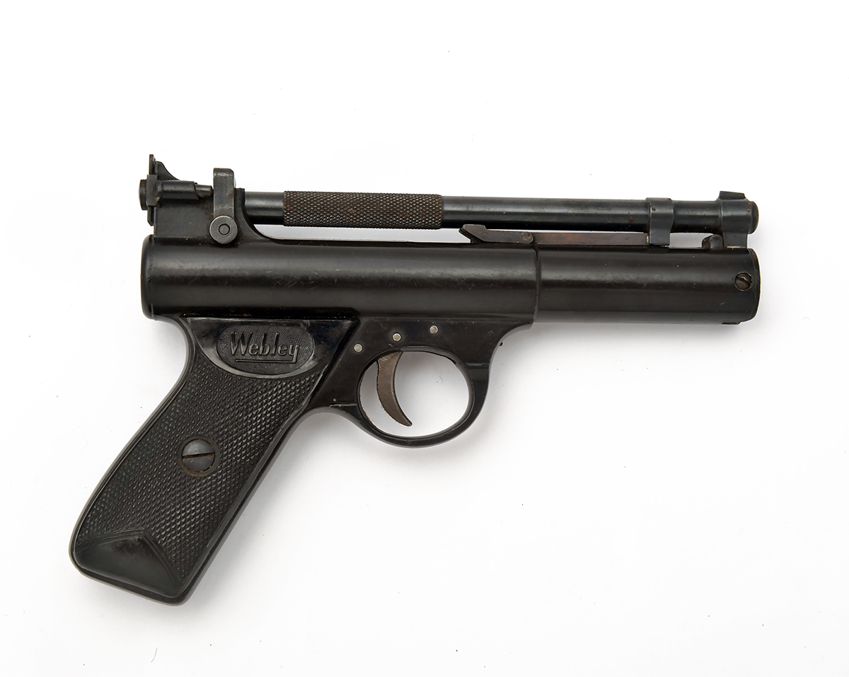A .177 BARREL-COCKING AIR-PISTOL SIGNED WEBLEY & SCOTT, MODEL PREMIER, batch no. 205, with blued 6 5/8in. barrel, stirrup barrel latch, stove-enamelled finish and chequered black plastic grips,much finish remaining