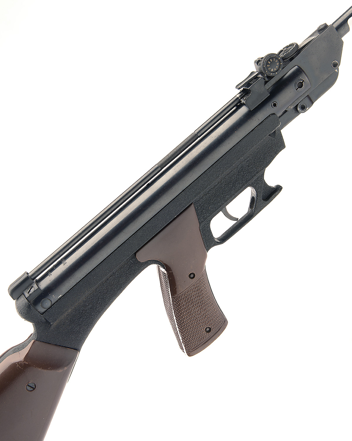 A .177 BREAK-BARREL REPEATING AIR-RIFLE SIGNED GAMO, MODEL 'ASI PARATROOPER REPEATER', serial no. 076782, with 17 3/4in. sighted barrel, pellet feed mounted to top of the railed air-chamber, black crackle finish receiver and abs plastic panels to the pistol-grip butt, some loss to finish but generally collector's condition