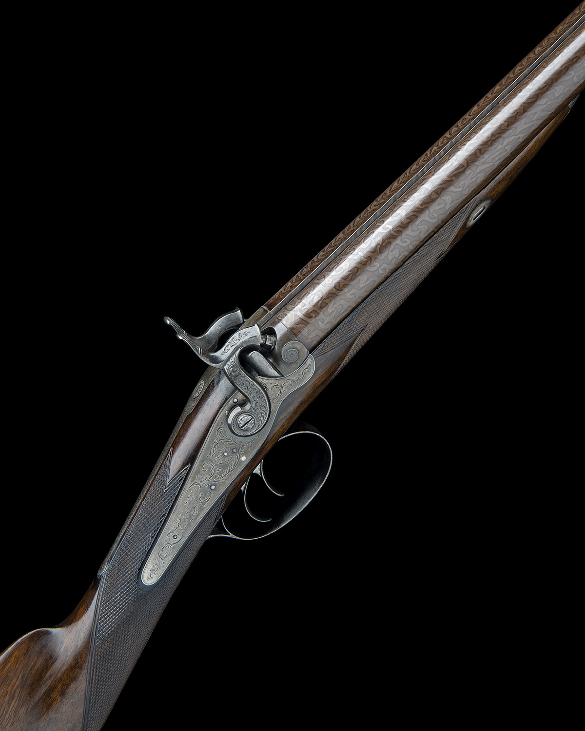 for between 1829-35, with re-browned damascus 28in. barrels, the broad top-rib signed 'ALDEN & SMITH, 55 PARLIAMENT ST, LONDON' (rubbed), bead fore-sight, gamebird engraved to the rib-end, moulded breech-blocks with engraved plugs, fully engraved long top-tang, borderline and scroll moustached back-action locks signed 'ALDEN & SMITH', chequered walnut half-stock (small crack forming alongside tip of top-tang), engraved iron furniture and brass mounted ebony ramrod, together with its walnut storage case numbered to the gun (lid cracked), the interior line and compartmented in embossed leatherette, the inside of lid bearing a parchment trade label 'SMITH & ALDEN (FROM J. MANTONS) GUN MAKERS TO THE ROYAL FAMILY, 55 PARLIAMENT STREET, LONDON' and containing a period flask along with some cleaning tools (one compartment lid and wad box absent)